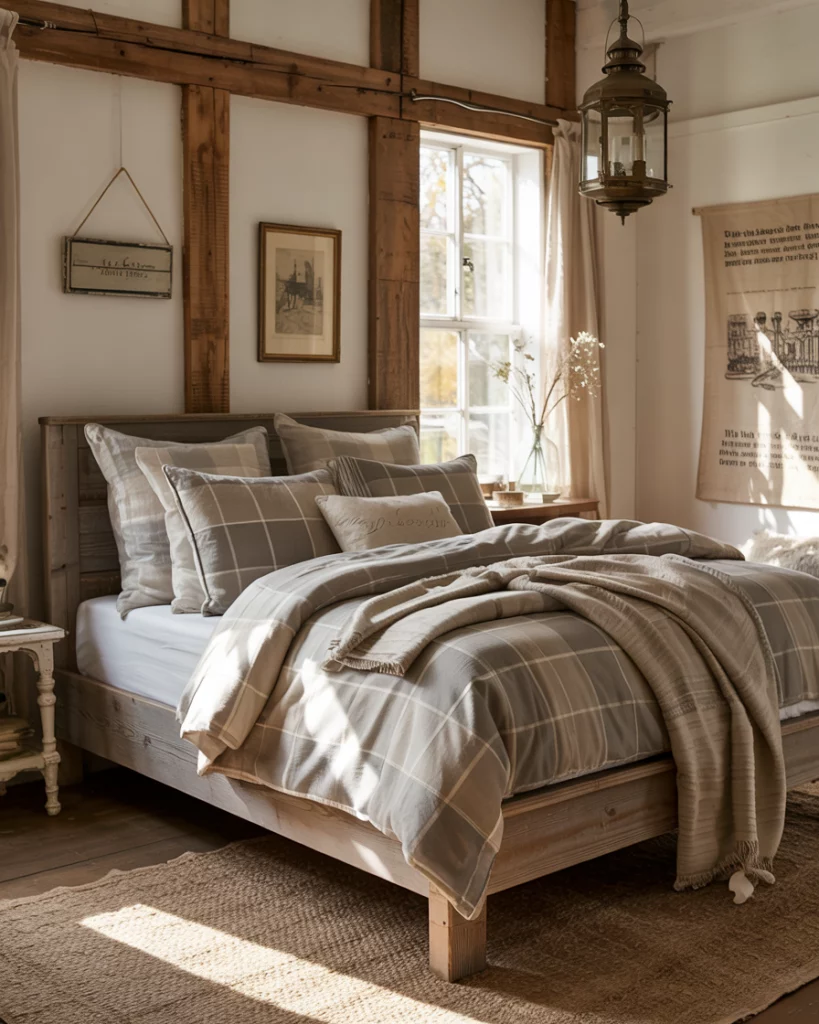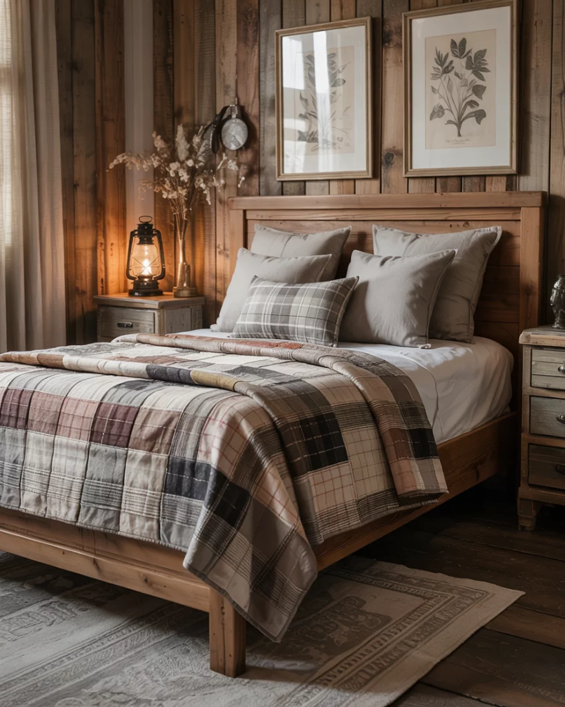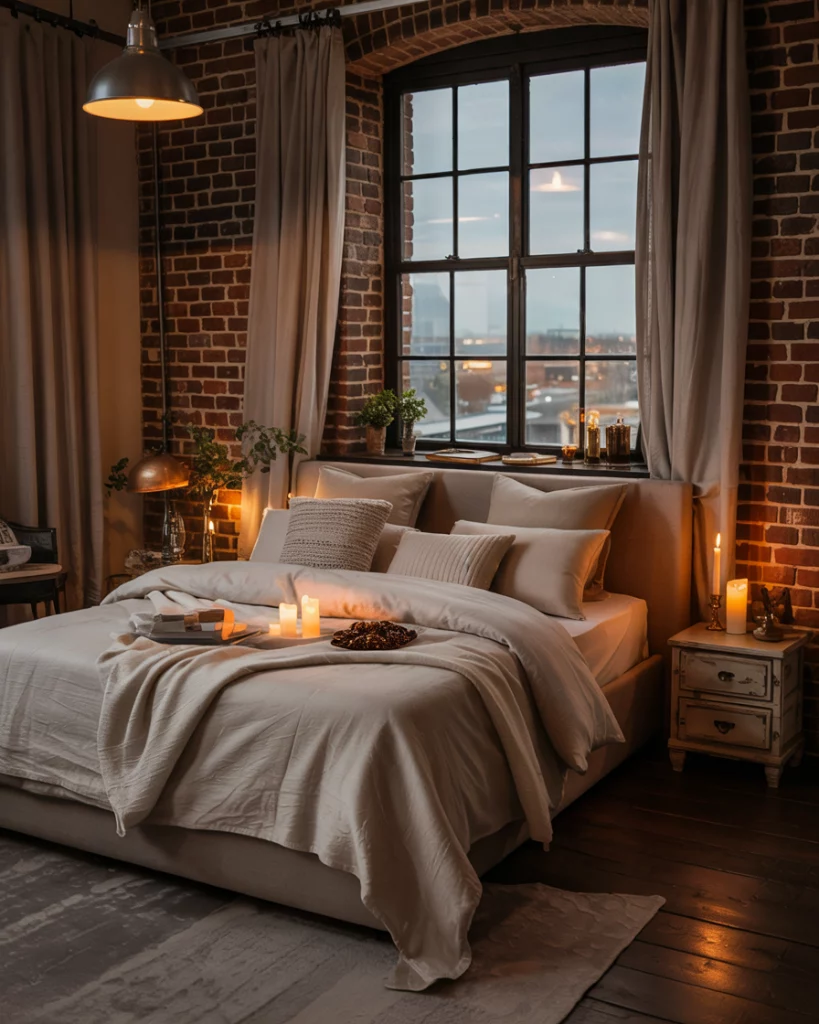 There’s something soul-warming about a rustic bedroom, especially one filled with reclaimed wood, soft flannel, and warm earth tones. The ideal place yoked with couples love that exists in simplicity and comfort. Cover the bed with embossed bedclothes, equip it with old light lanterns and paint one of the walls in the shape of stone or faux bricks. It’s a grounding space for anniversary nights or just cozying up under the stars.