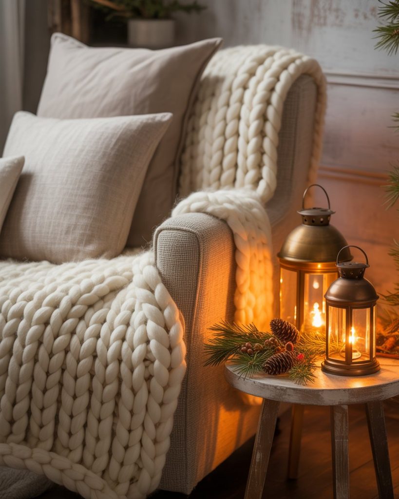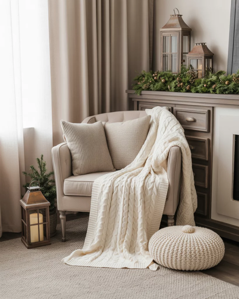 The holidays are all about taking the time to relax and building a comfortable reading corner with some rustic elements can make your living room seem even more special. Incorporate oversized knit blankets, neutral pillows, and a small white side table with natural greenery. To add the contemporary flair, combine with old-fashioned lanterns. This is a popular diy setup, as many design blogs, such as The Spruce, recommend the use of textures to be layered to create warmth. It is a very basic concept that converts the empty spaces into holiday havens.
