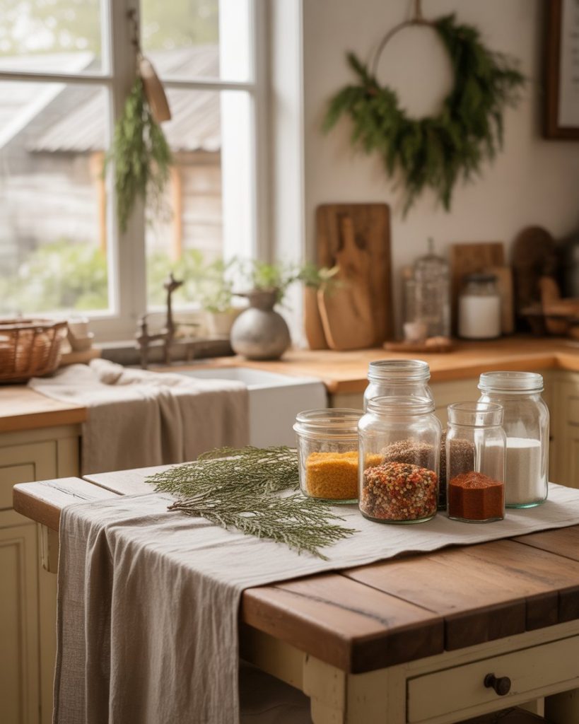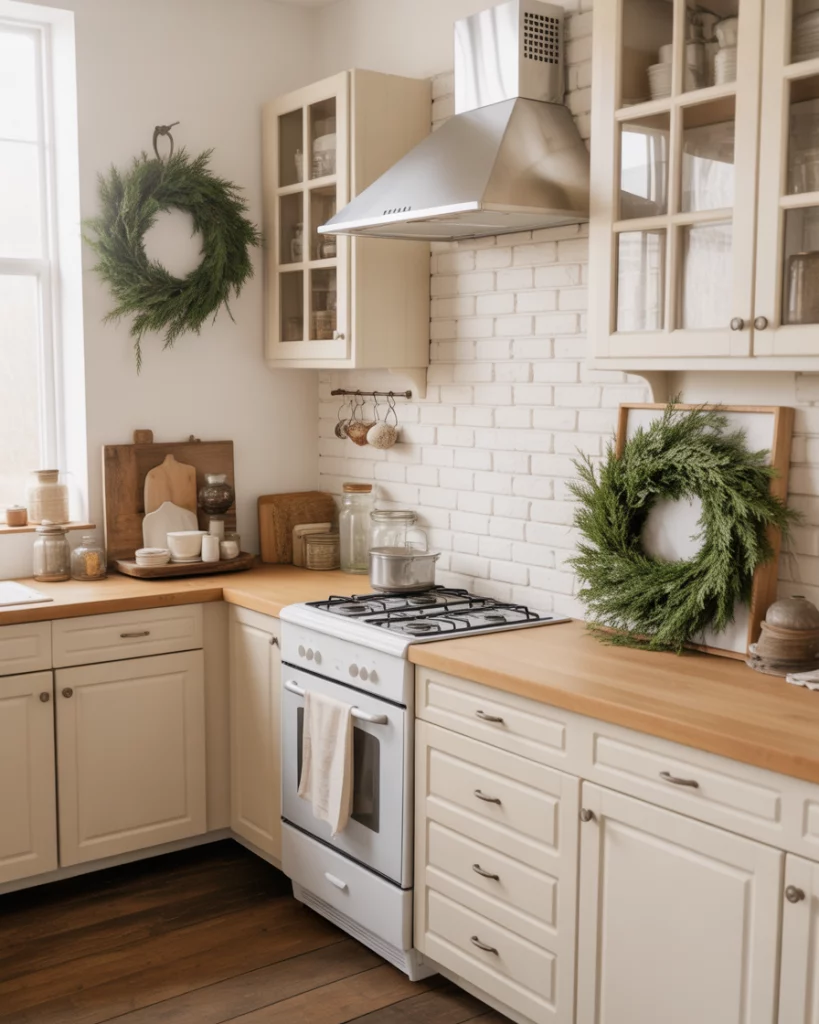 The kitchen is a place that should be loved on holiday. Include natural objects such as cedar branching over cabinets or basic diy wreaths on cabinet doors. Put old jars of cookies or spices in to add some charm. To create the farmhouse look, neutral linens and white enamel mugs placed on open shelves. This provides a comfortable baking and family time. I have always discovered that the decoration of the kitchen puts one in a good mood immediately even during holidays.