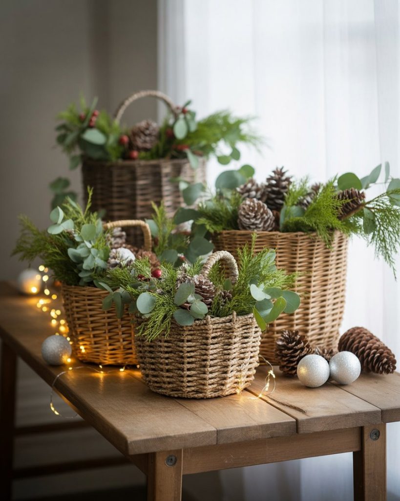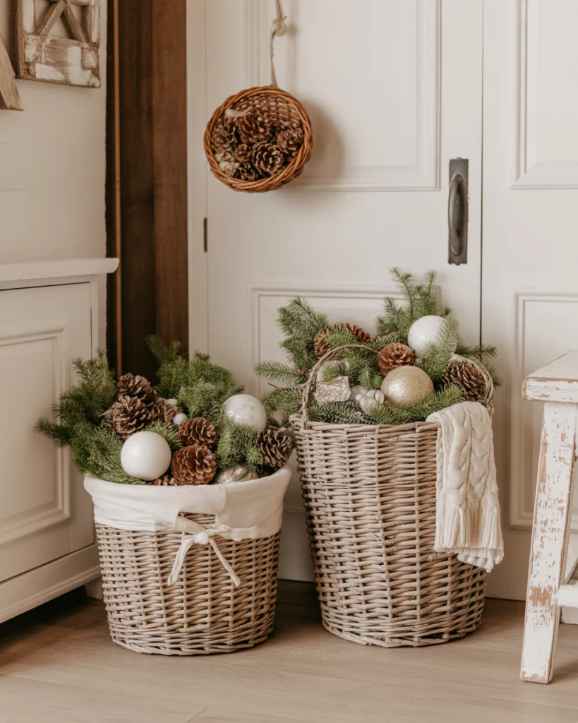 Wreaths of wicker or used wood are excellent diy projects. Add pine branches, cinnamon sticks or ornaments to make them look natural. These baskets are farmhouse style and are beautiful as concepts of accents in living rooms. I once applied the neutral greenery to a white painted basket and this made the entire room seem to have a soft and modern holiday atmosphere. It is an easy method of bringing warmth to corners or doorways.