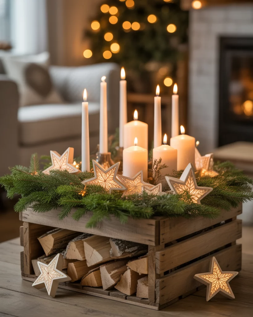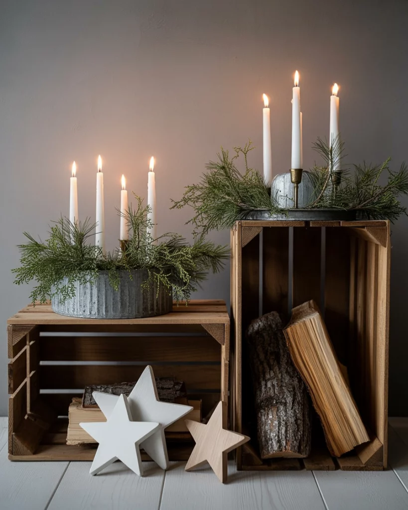 Wooden crates can be made into festive ideas diy crafts that bring out the farmhouse charm. Stuff them with wood, white candles or natural pine branches to make homey corners in the living room. There are those who place crates on top of each other to create a rustic tree form, or an ingenious modern adaptation. It is a basic project that can also be used outside on the porches. It is easy to make it personal, adding vintage ribbons or tiny wood stars, and the possibilities of country holiday decorating ideas are endless.