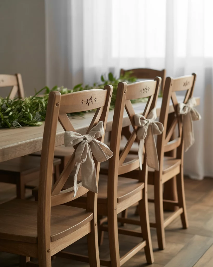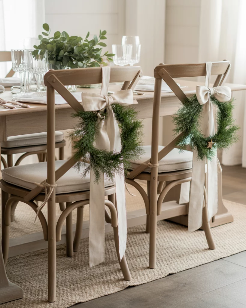 Dining chairs may be included into the decoration during the holiday. Bow tie neutral linen, or hang mini wood stars, or cover natural greenery to make it look like a festive farmhouse. The project is simple but effective and provides guests with a warm reception. The combination of modern and old is achieved by adding vintage fabric scraps or white lace ribbons. I have once put cinnamon sticks on the back of chairs and the warm smelling was all over the living room.