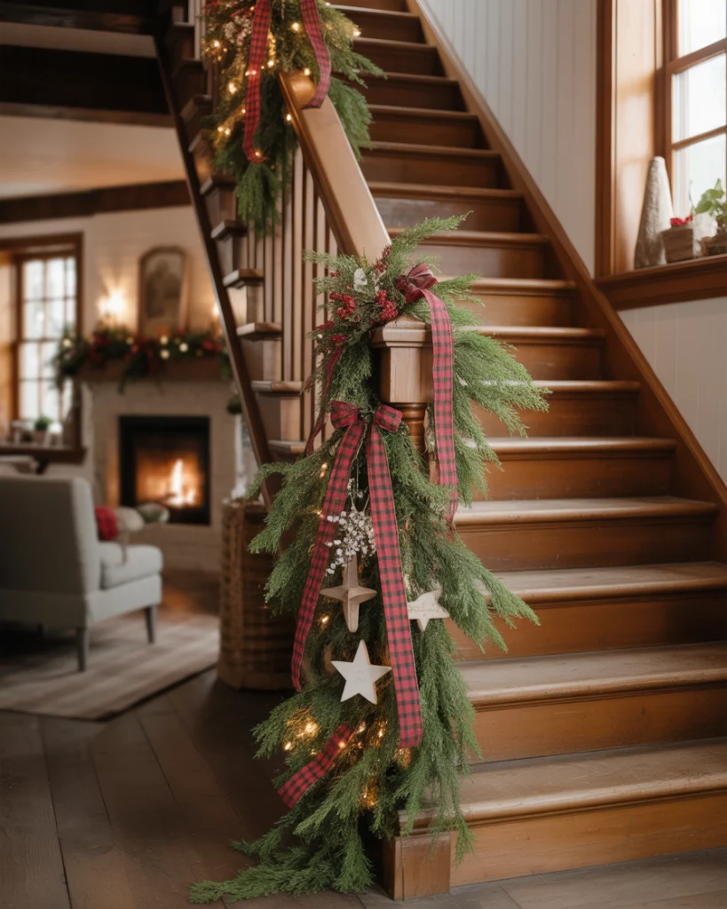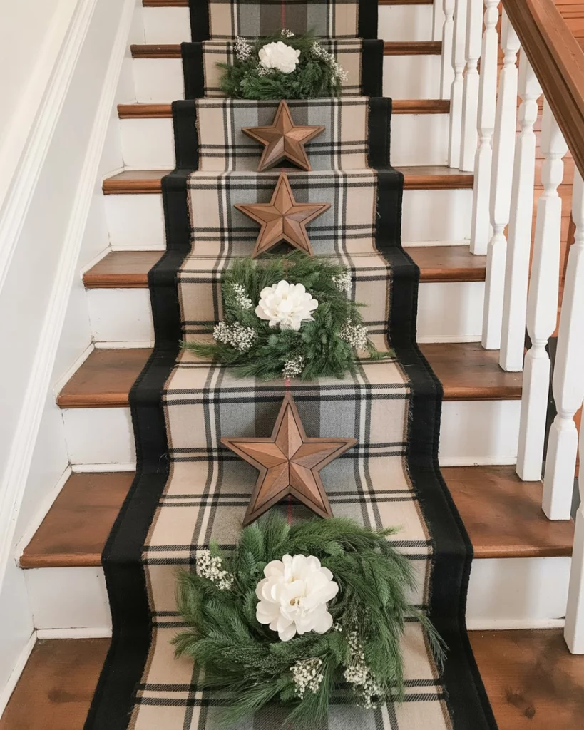 A staircase is a natural canvas on which to base the country holiday decorating ideas. Cover wrap railings with natural pine garlands, stuff in snug plaid fabrics and hang wood stars or white ornaments. This low-tech DIY solution will immediately turn halls into Christmas decorations. According to many design blogs, neutral ribbon is suggested to create a balance between greenery and vintage details. In my case, the painted steps always precondition the happy family meetings in the living room.