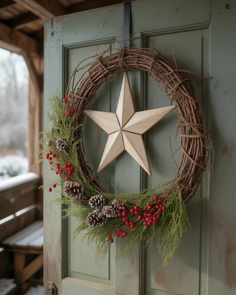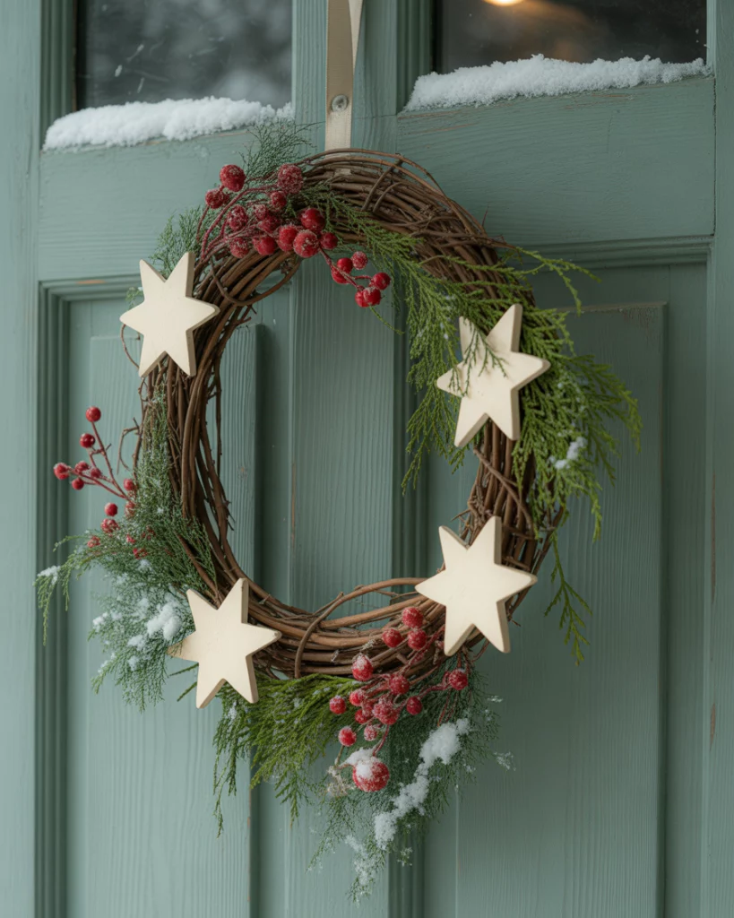 Rustic style is strongly based on the beauty of nature, and wreaths of twigs, cedar and berries are the best examples of it. The simple charm of farmhouse vibe is achieved by adding wooden stars that are made by hand or dried slices of citrus. These wreaths are trending in ideas diy crafts, since anyone can find materials in a yard or local market. They are also suitable to be used in the living room on the walls or doors because they give a cosy warm effect when hung.