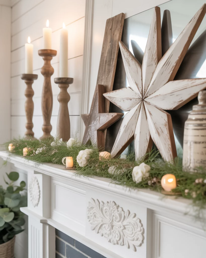 9. Vintage Accent Mantel Decor with Rustic Decor.