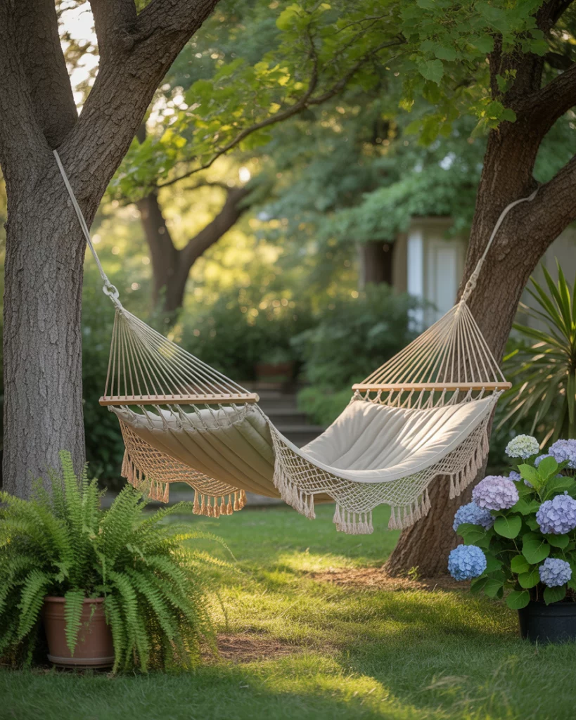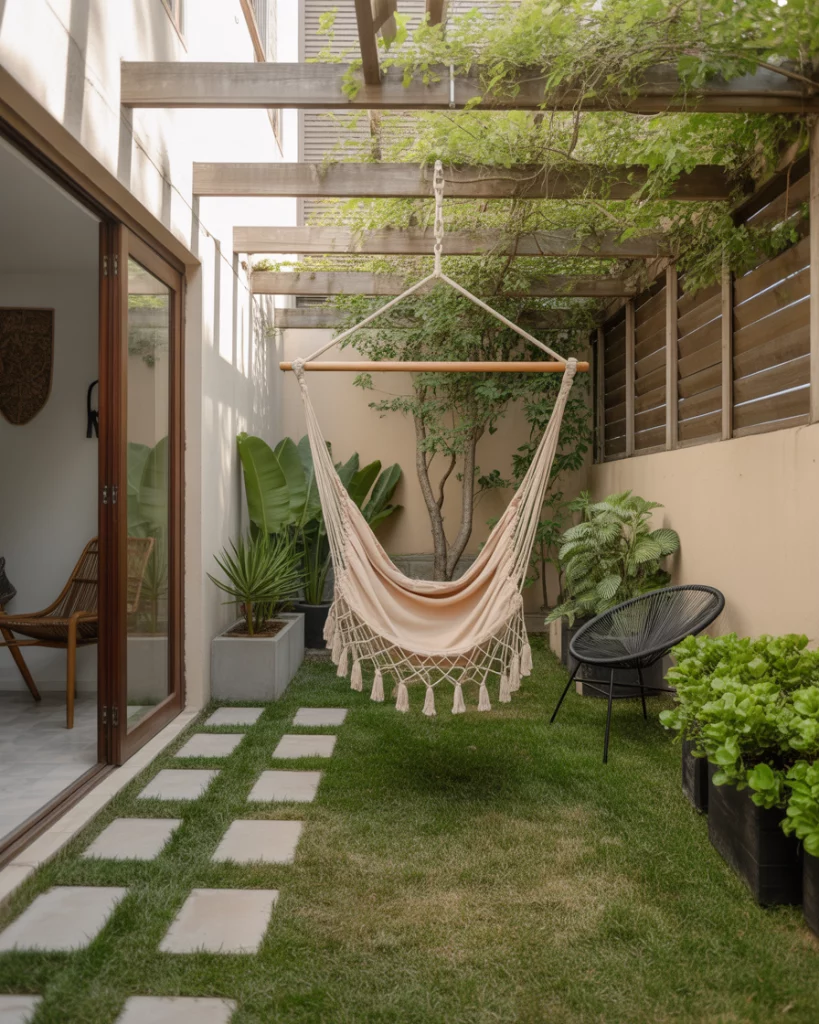 Nothing is more relaxing than a hammock or a swinging chair under a tree or a pergola. It is a mere addition that creates a vacation atmosphere in a very small area. It is a cost effective way of making a mini holiday on your own or with your guests. Even tight corners can be dreamy, influencers such as @ChrisLovesJulia demonstrate.