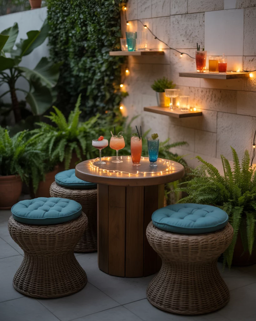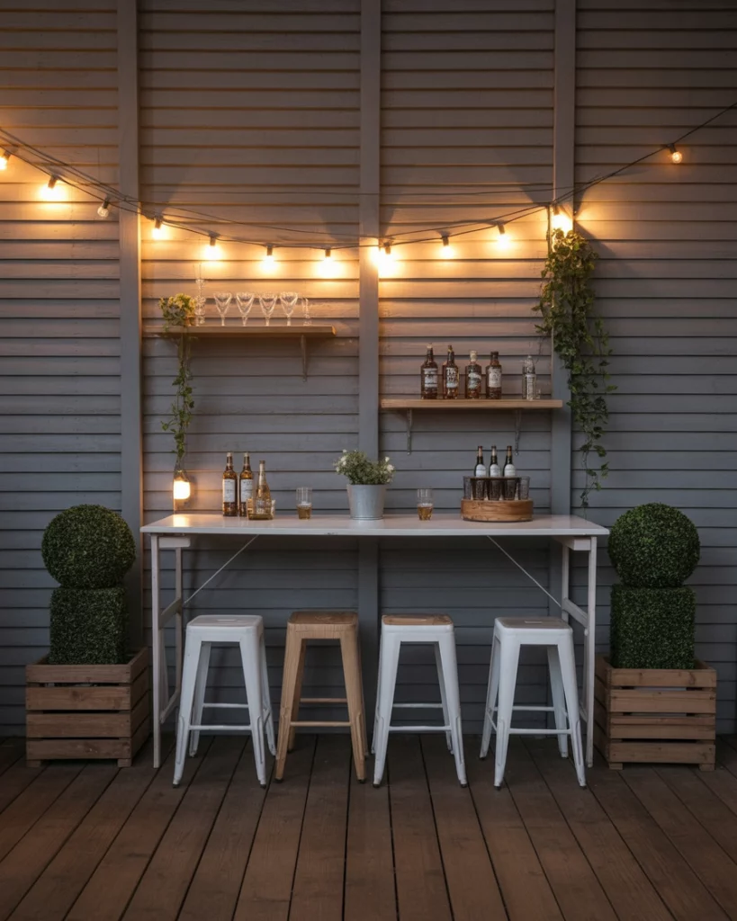 Outdoor bar cart or drink station is a pretty and useful addition to entertainers. Mini-bar may be made of reclaimed wood or a diy project to make it renter friendly. It does not occupy a lot of space and can be relocated indoors when necessary. Hang lights or shelves over it to provide additional beauty. Prompt Small backyard with DIY outdoor bar cart.