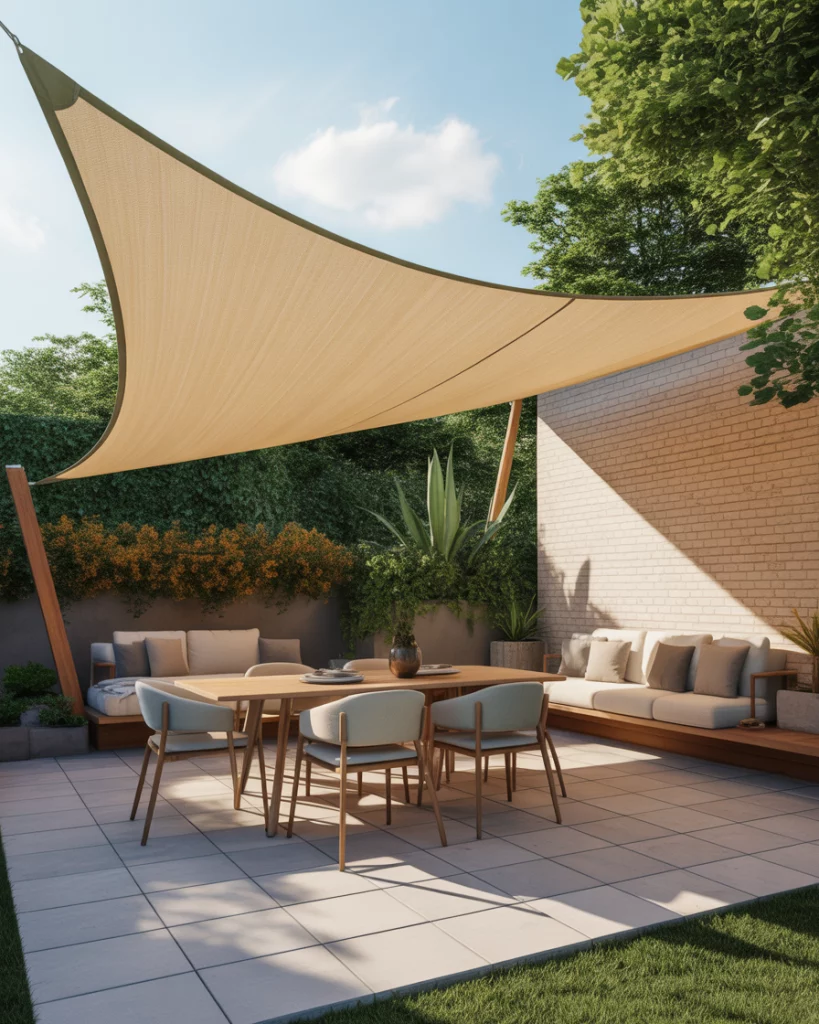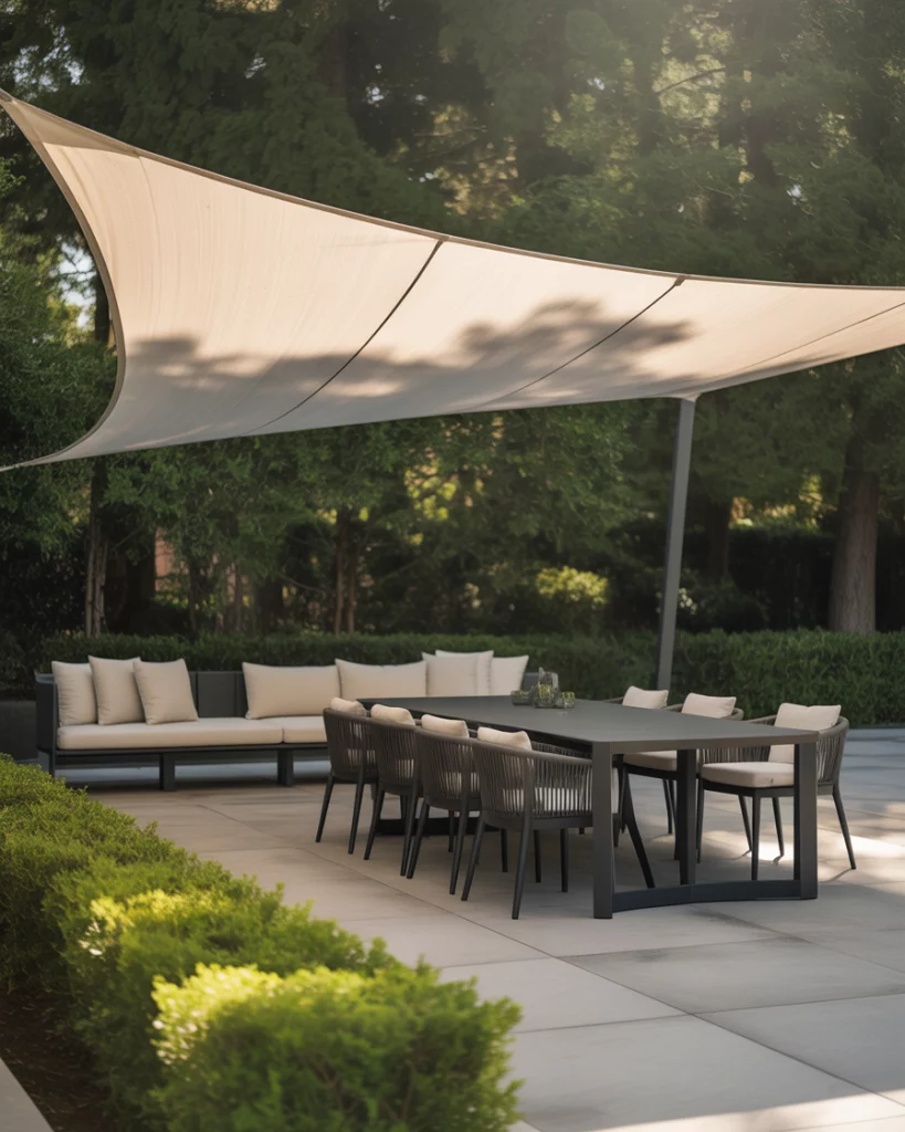 The solution to getting coziness in sunny backyards without investing in a pergola is adding a shade sail. They are simple to mount and rent or on a budget basis. Big dining areas, playgrounds with kids, or pool located in area, which provides a smooth modern appearance.