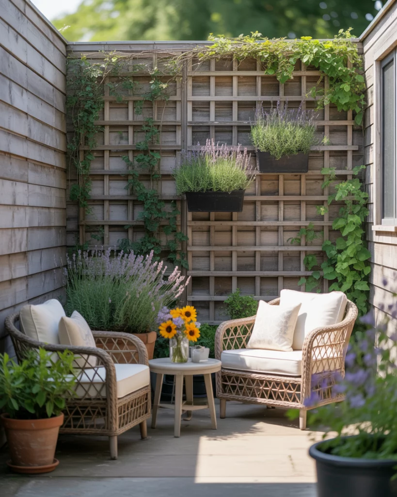 Privacy screen or trellis provides style and privacy, particularly in common yards or tenants friendly yards. Plants: ivy or jasmine to climb up the train to provide scent and color. On a tight budget, an easy way to use lattice, bamboo or recycled wood as a double purpose as decor and privacy.