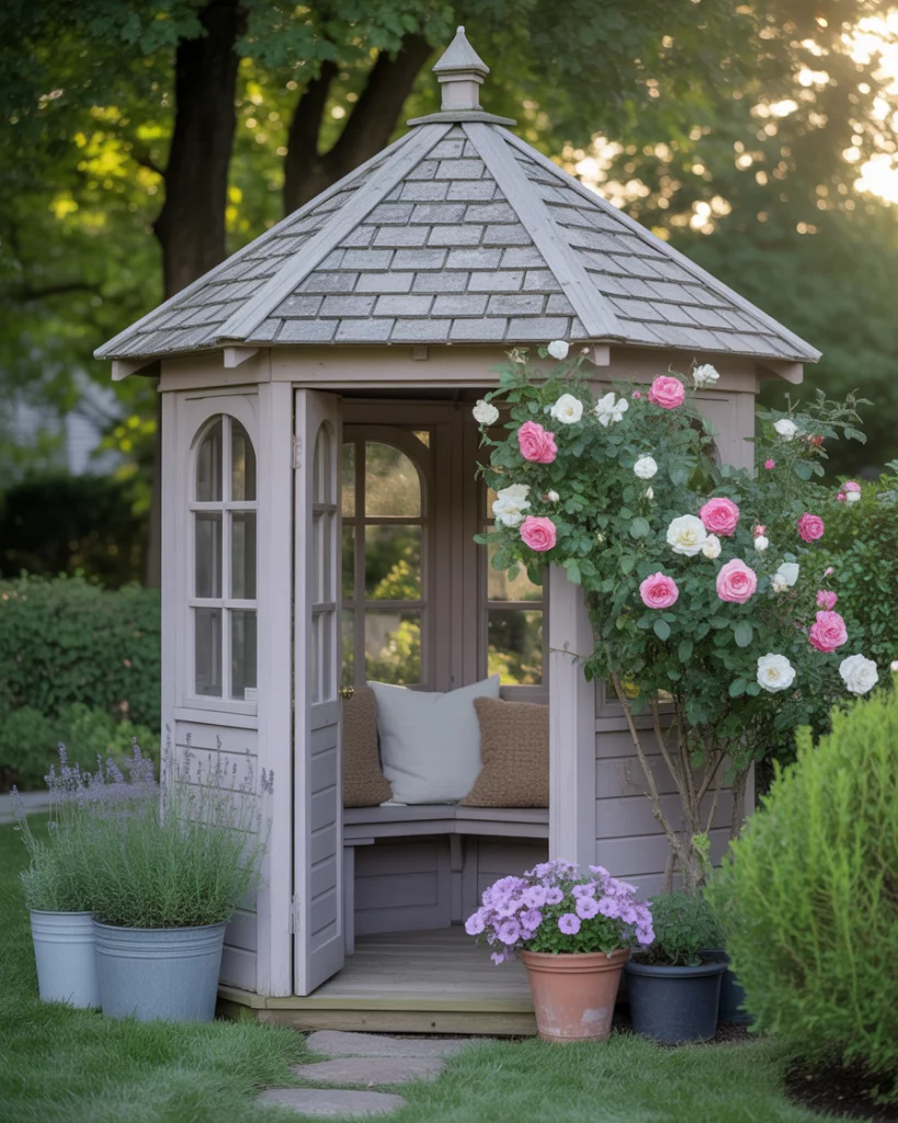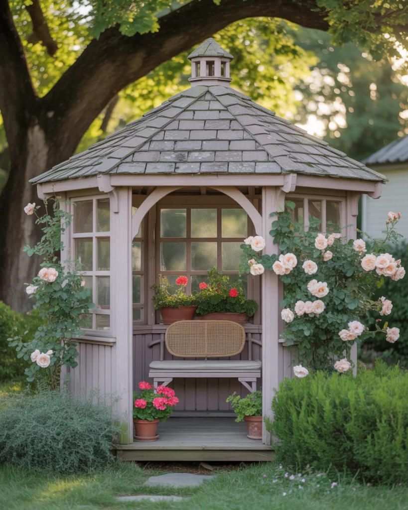 A gazebo does not have to be big or decorated with details to be impressive. Choose a sloping-roof, small model as shade, reading nook or even outside home office. The concept suits a very comfortable garden or patio area and is very comfortable and stylish. In addition, small gazebos can be found at the large retailers at a low cost.