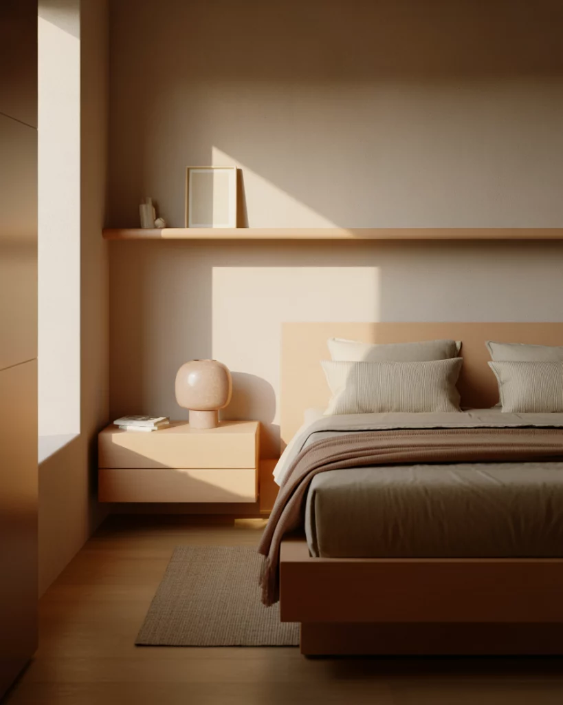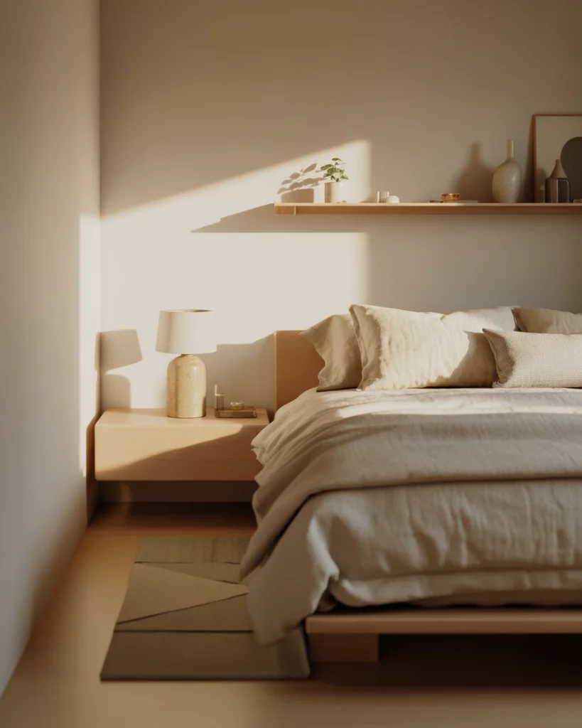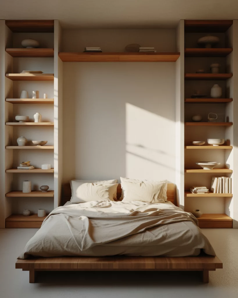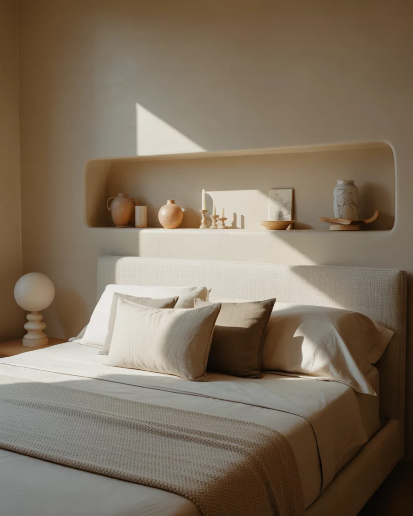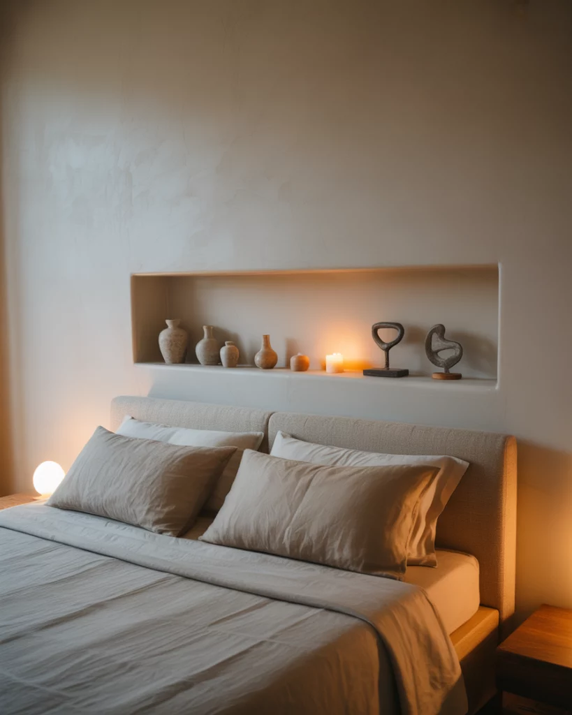 A built-in ledge behind the bed adds depth and practicality without crowding the room. It feels intentional and can replace bulky nightstands, complementing ideas for couples, streamlined layout ideas, and compact small bedroom ideas. This subtle architectural detail also collects décor without overwhelming small surfaces.