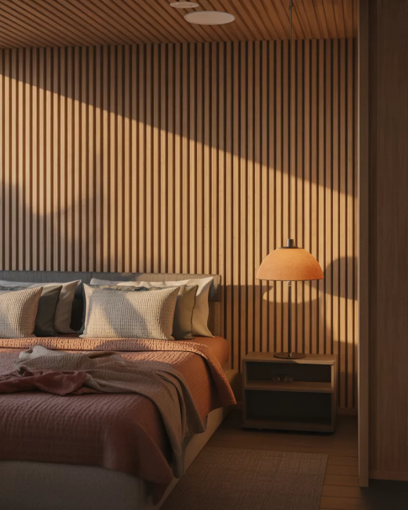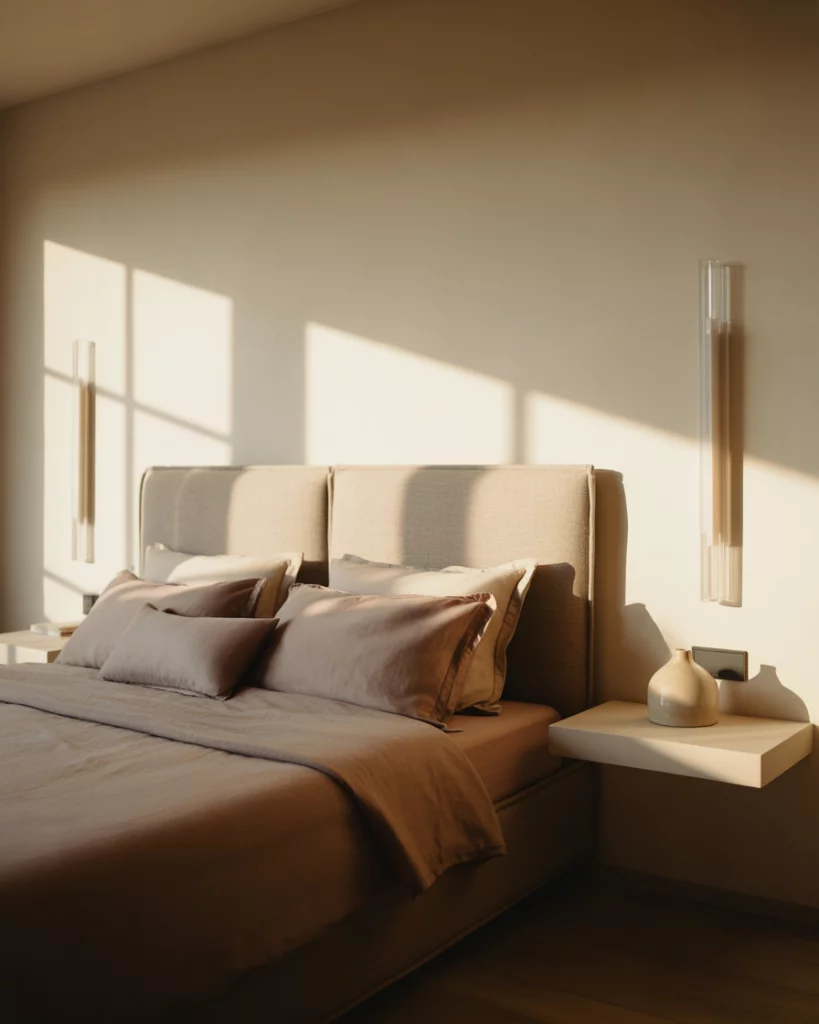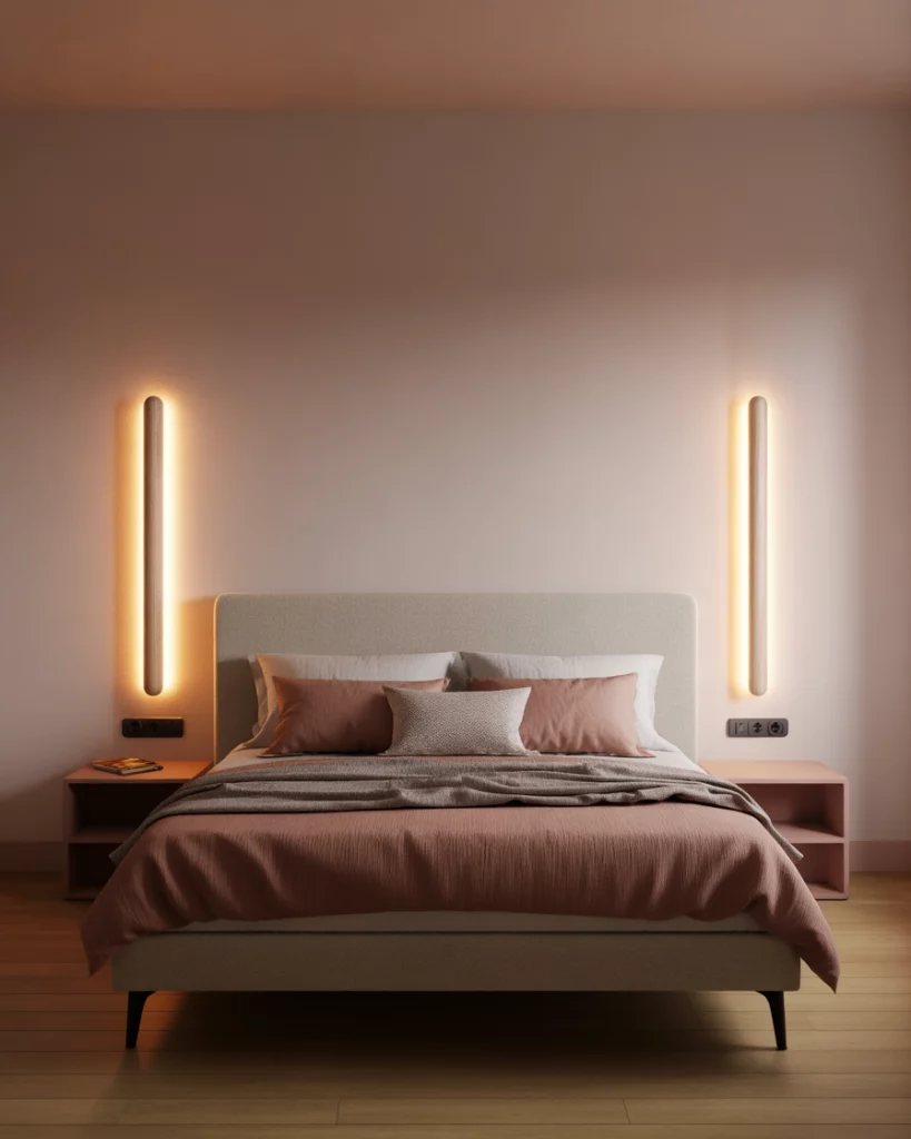 Wall-mounted lighting bars deliver soft, even illumination without taking up precious bedside space. They complement minimalist interior palettes, warm mall bedroom ideas, and elegant designs. Their narrow silhouette stretches the visual height of the room, helping even small spaces feel taller and more balanced.