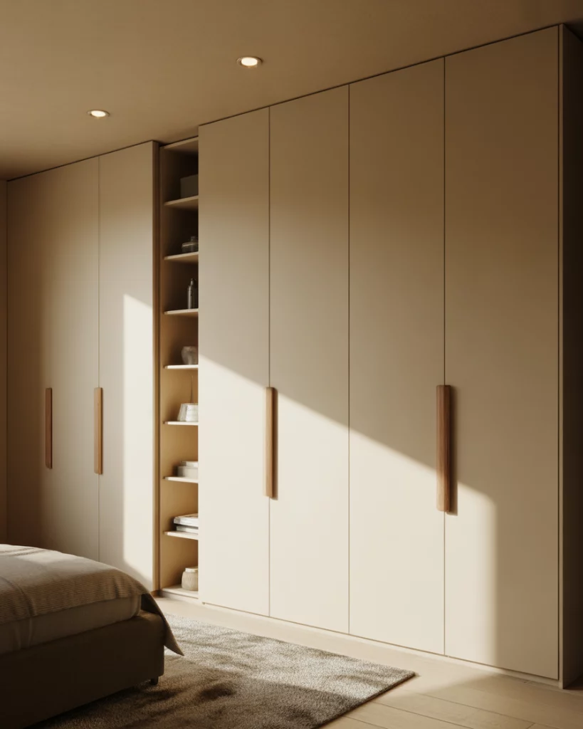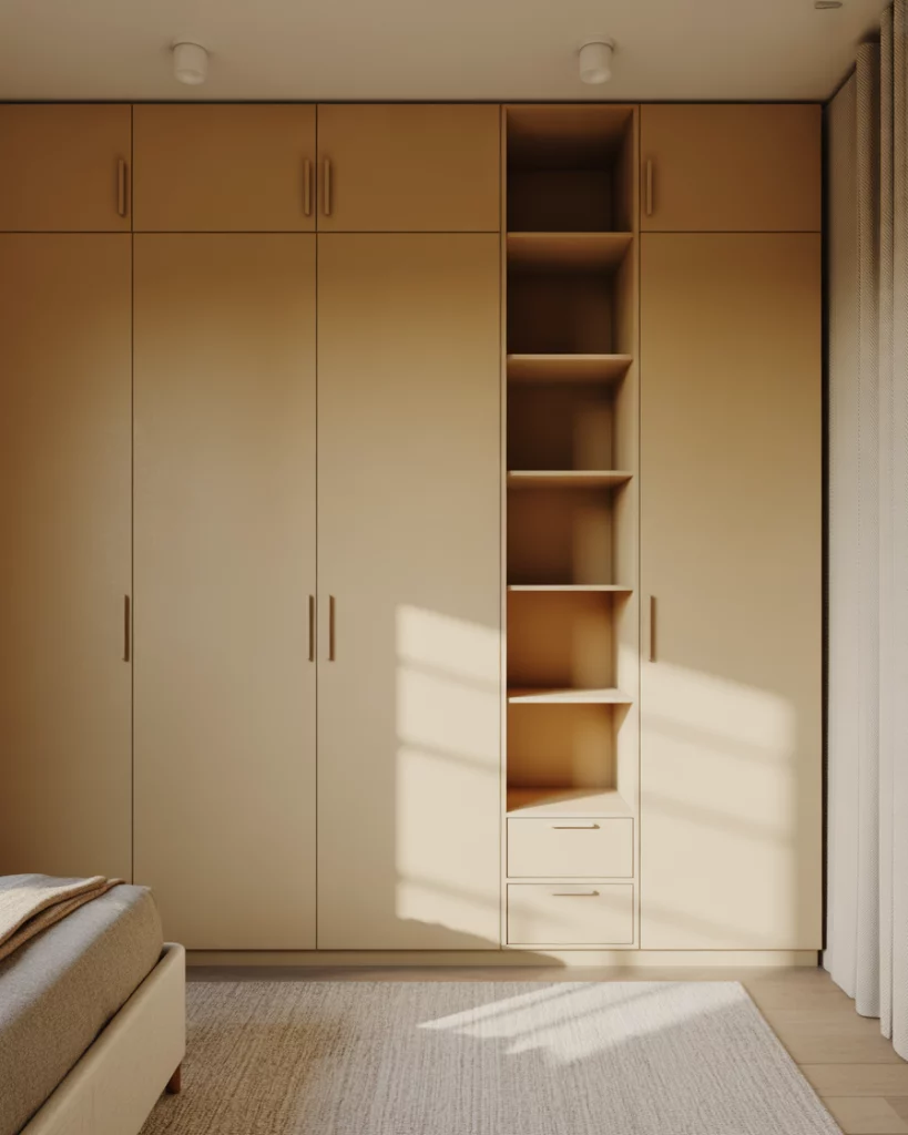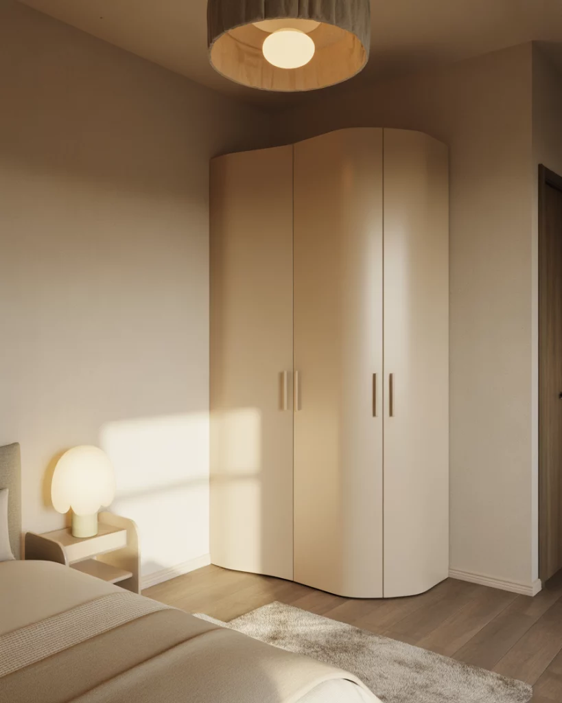 An angled wardrobe features smooth corners in small spaces while using the corners to store useful space where space isn’t utilized in many rooms. It fits well with prime wardrobe designs, gentle designs, and small designs to use in decorating. It maintains comfortable pathways and visually smooth designs.