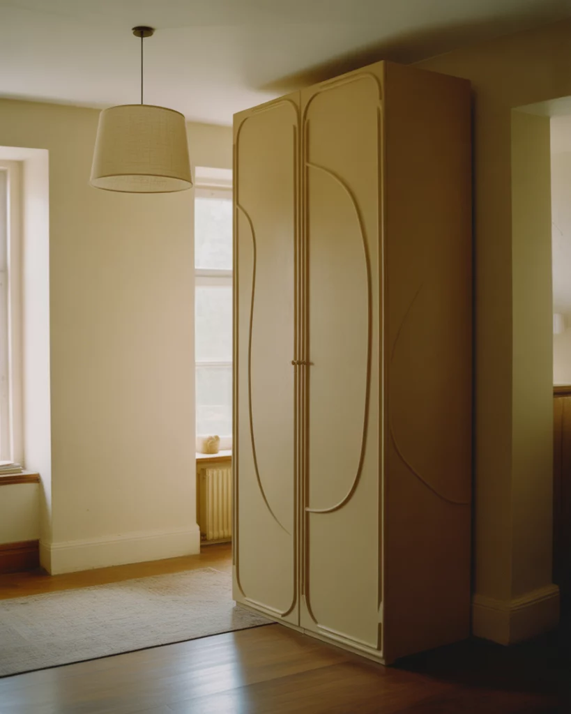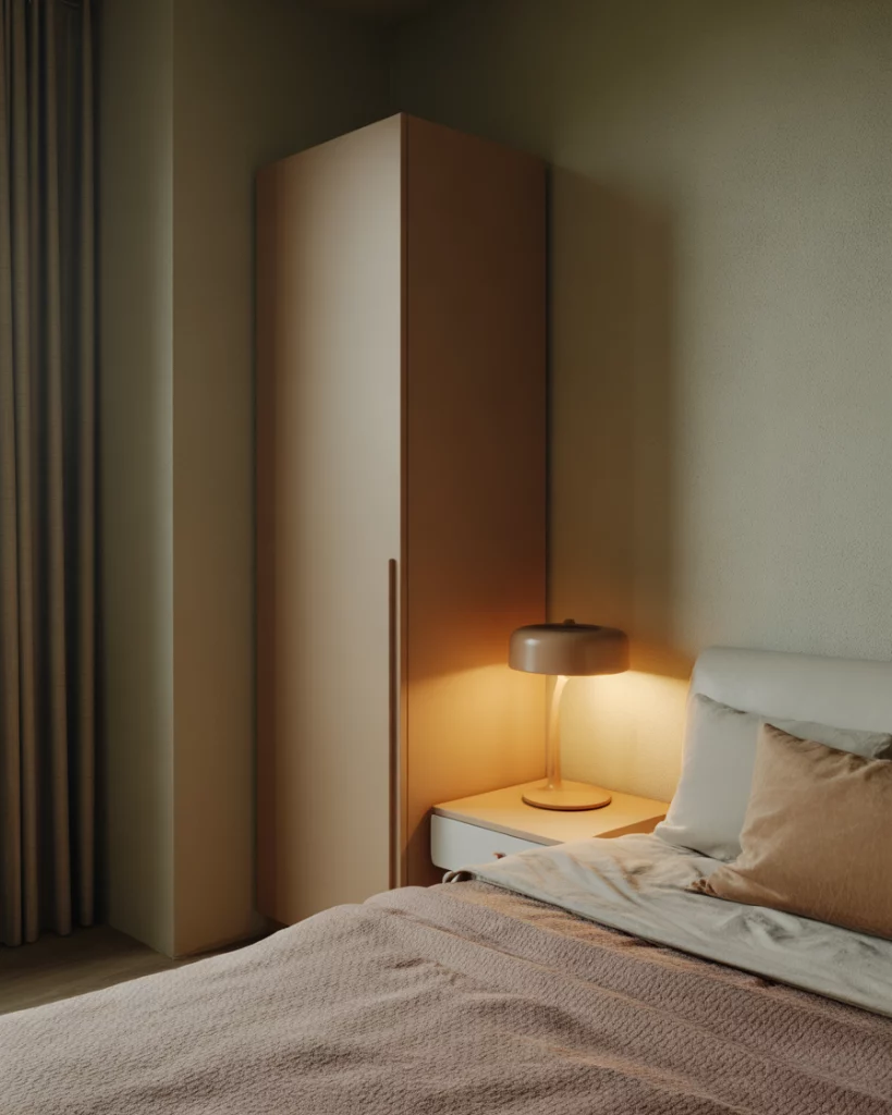 Installing a tall and thin cabinet alongside the bed creates an interesting vertical statement and increases space through deep storage inside compact designs. These designs go hand-in-hand with efficient cabinet ideas, solution-oriented habits, and simplified space makeovers. The stacked design gives the space much-needed structuring without taking up space.