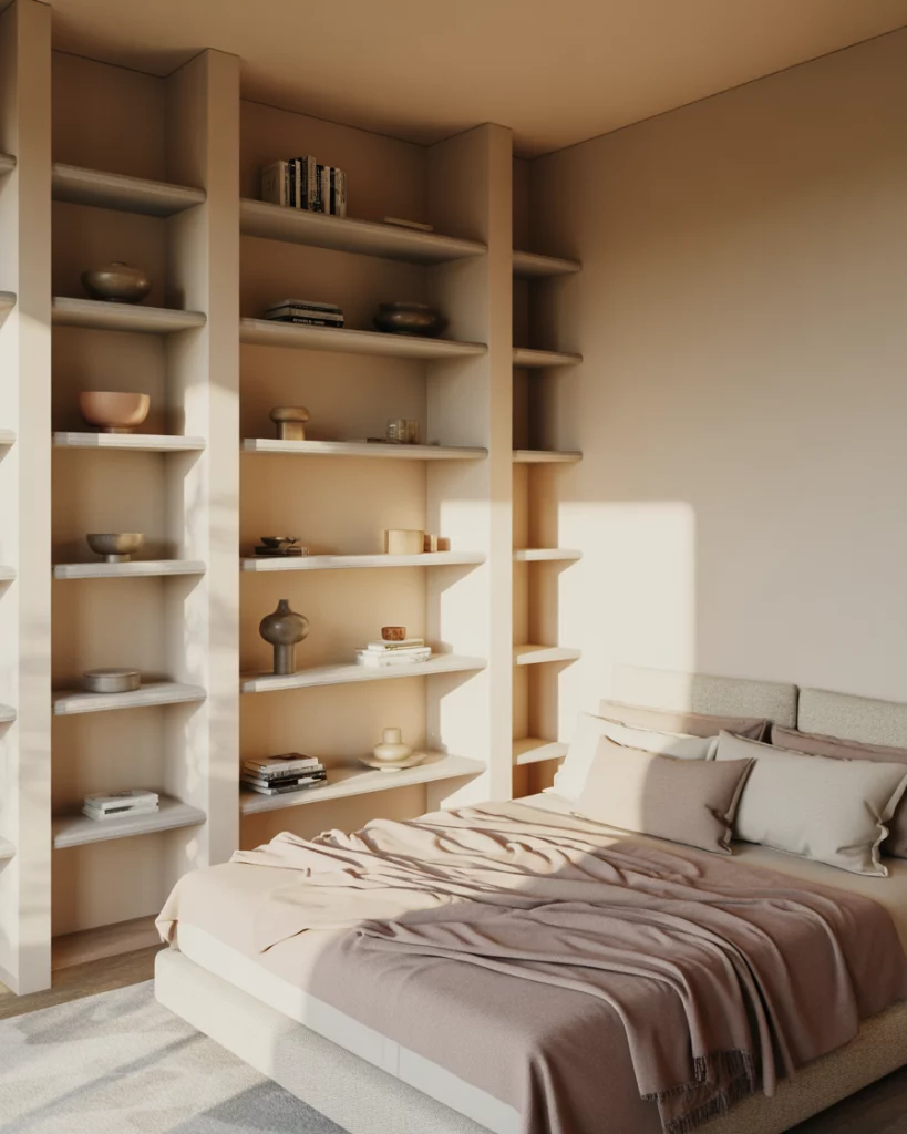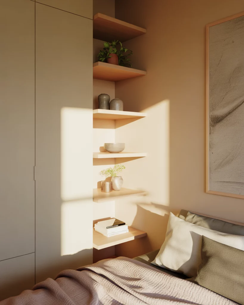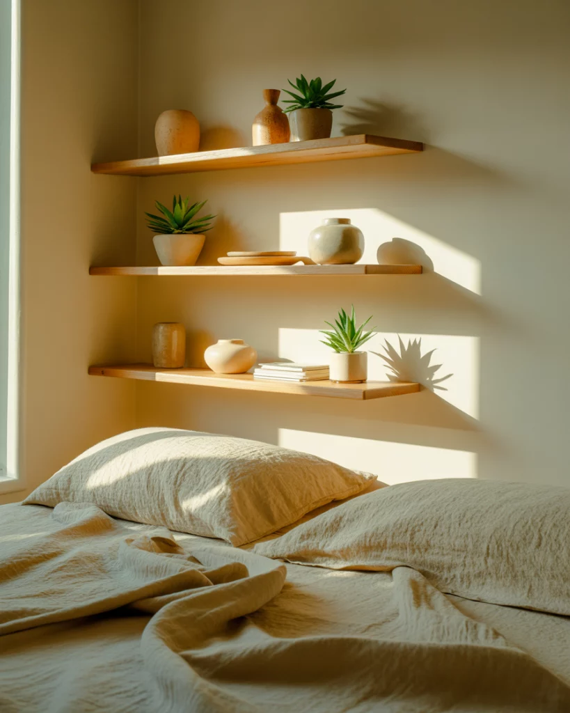 Installing several wall shelves above the bed in small-space homes creates ample vertical space without cluttering the surfaces with many objects. It fits well with minimalist designs, interesting designs in ideas, and other designs in terms of textures. It maintains simplicity, being both functional and aesthetically appealing, using it to display objects such as lamps, vases, or plants.