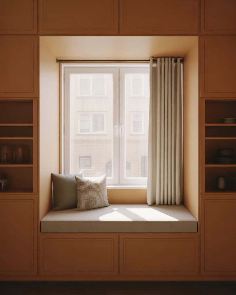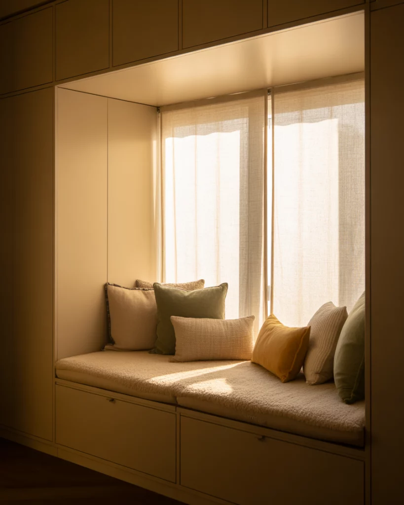 The space under the window in homes containing comfortable benches with internal storage offers space both in comfort and in deposits in homes. It fits well with designs related to comfortable rooms in homes, warm ideas in cozy designs, and other designs using decorations in homes’ rooms. It maintains both comfort and deposits in homes’ space without entirely using any space.