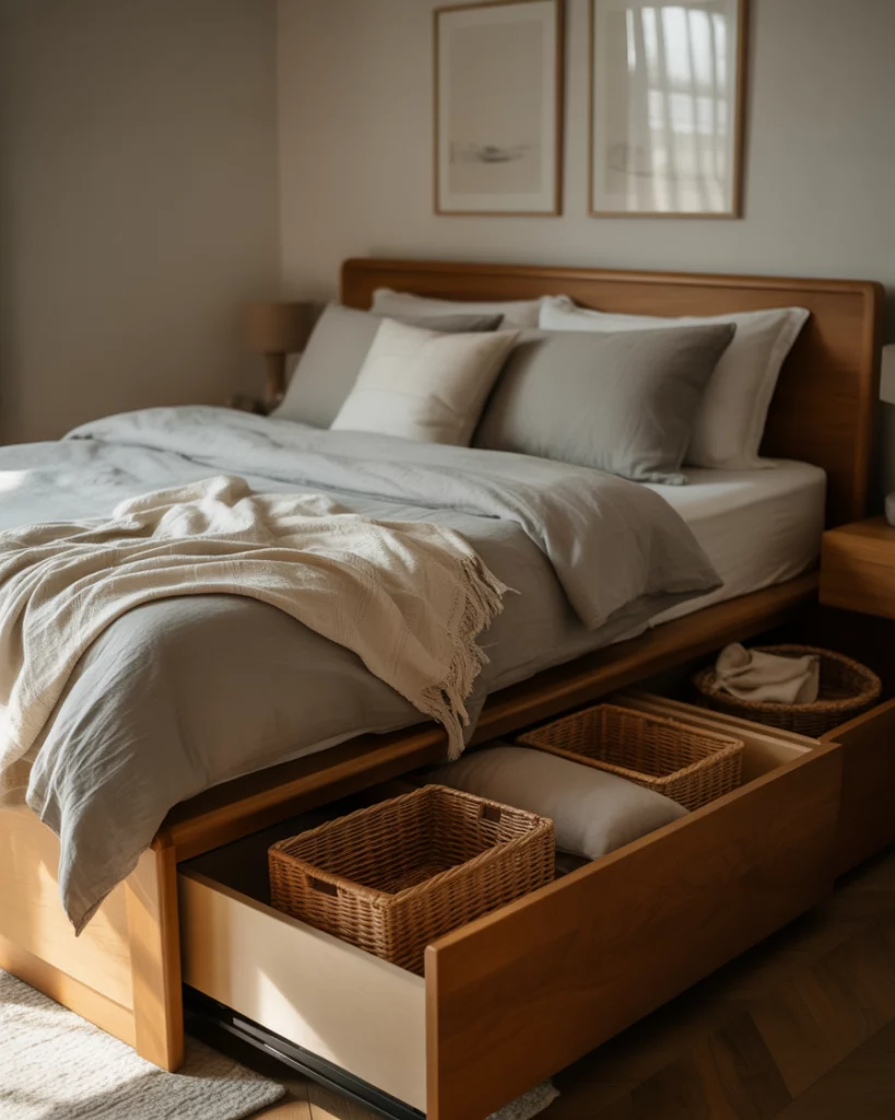 Under-bed drawer storage expands space under the bed to offer an optimal functional area suitable for storing linens, out-of-season clothing, or blankets. It works flawlessly in small rooms because it ensures the space maintains aesthetic designs without clutter despite having an optimal amount of functional designs in terms of organizational designs or inspirations.
