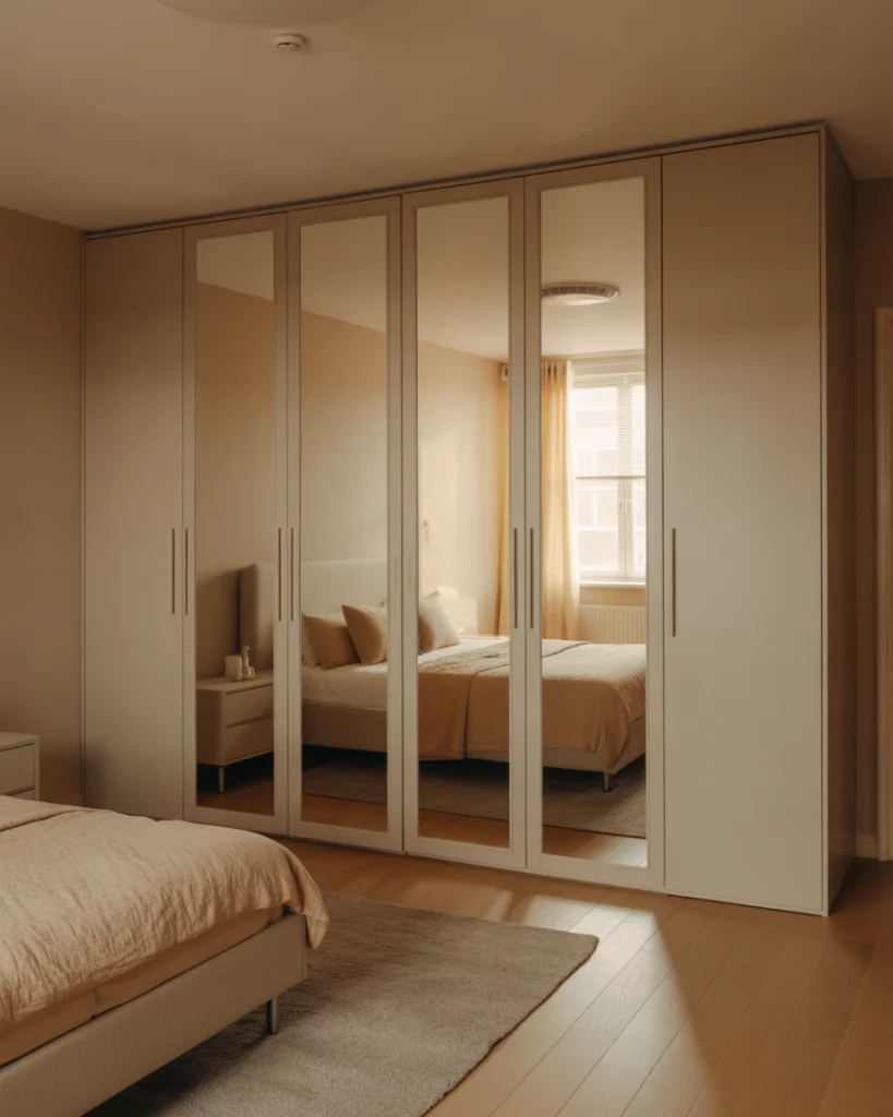 Mirrored wardrobe doors instantly make the space appear larger, creating the illusion of an open space when working in a cramped setting. These designs go hand-in-hand with smooth wardrobe ideas, minimalist closet designs, or well-considered makeover ideas. The added mirror increases the space without taking up any space. It instantly resolves all aging space issues.