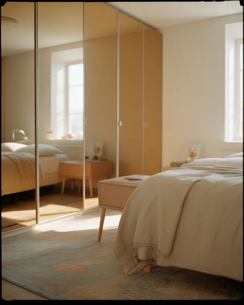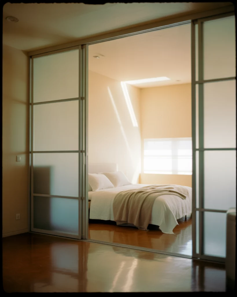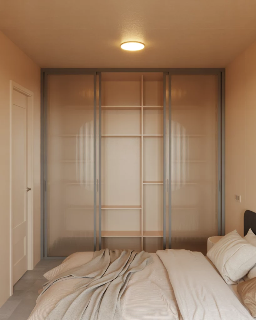 Frosted glass closet doors brighten a small bedroom by reflecting light while still hiding clutter. Their clean lines work well with modern closet ideas, soft room ideas, and chic designs. The translucence adds depth without introducing visual noise, giving the space a lighter, elevated feel.