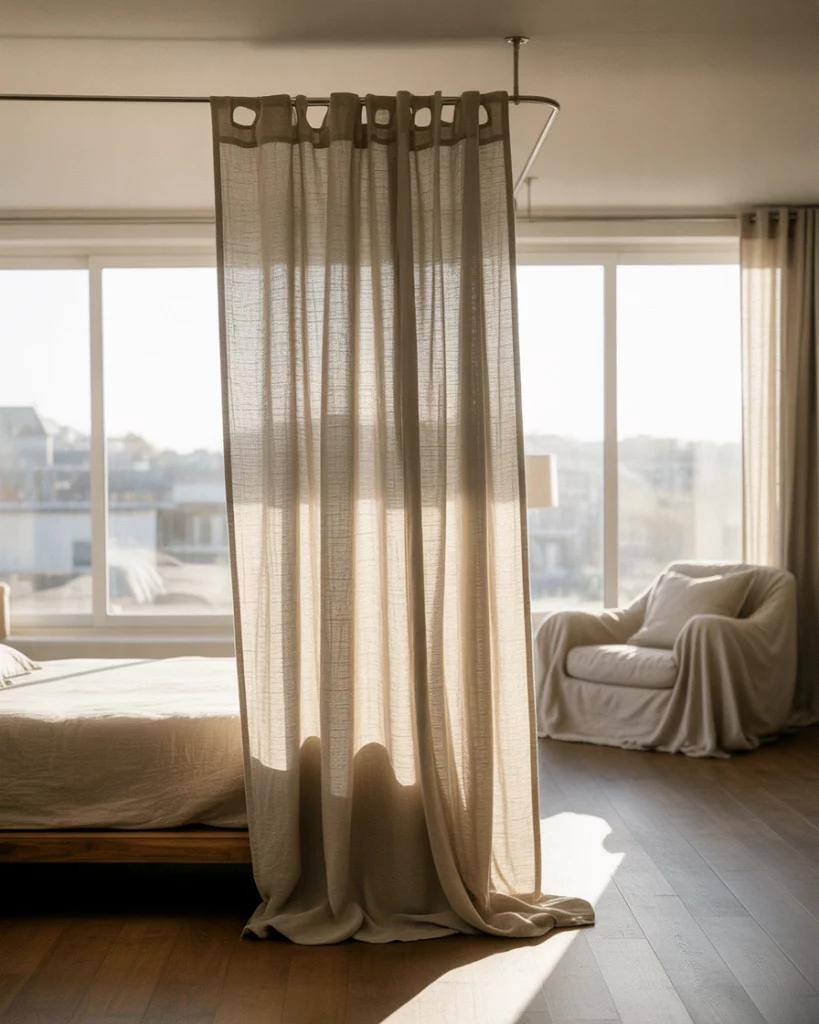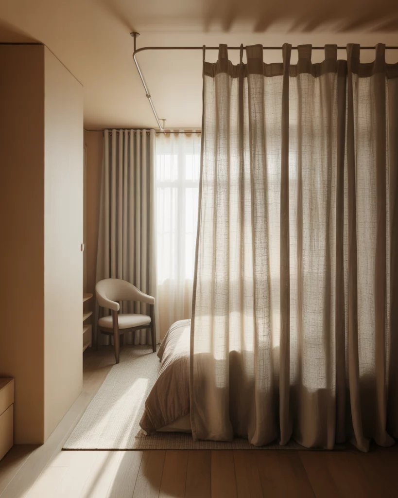 Installing curtains in a small space represents an evergreen approach to achieving seclusion in small bedrooms without fully closing the space. It suits layout ideas, relaxing space designs, and soothing designs. The softness of the curtains makes all designs cuddly and friendly.
