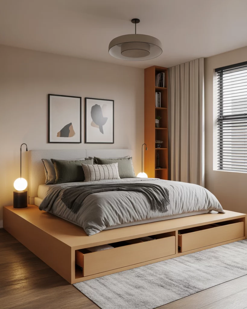 1. Elevated Platform Bed with Built-In Storage
