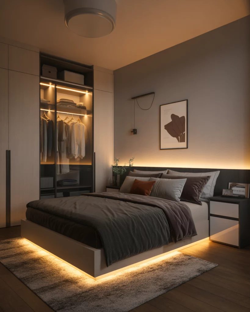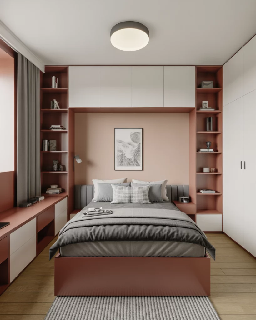 In a small apartment or compact room, combining functions helps keep the space open. A wall-mounted fold-down desk or vanity that tucks away when not in use lets you create a workspace or dressing area without sacrificing the cozy relaxing sleeping zone. This setup works especially well for teens or adults who work from home, and you can pair it with a slim closet or wardrobe along an adjacent wall. Designers emphasise that in small bedrooms “furniture floats” unless it’s well anchored or built in.
