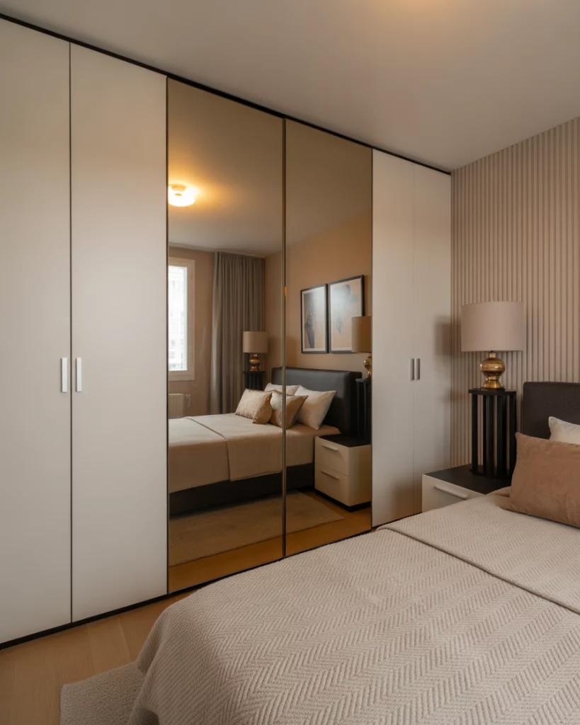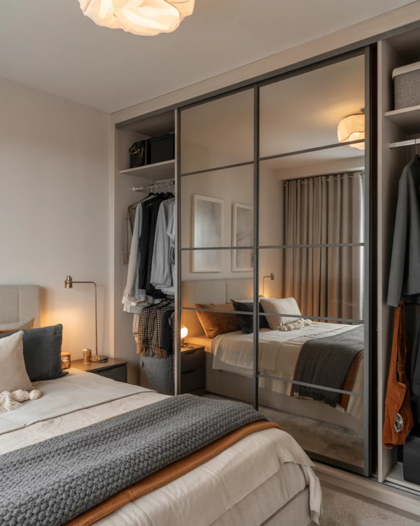 In smaller rooms, TV walls, wardrobes and mirrors can be more than functional—they can visually expand the space. A large mirror opposite a window or integrated mirrored wardrobe doors bounce light and depth, making the room appear very open yet still cozy. The key is not over-doing reflective surfaces, but strategically placing one or two to amplify natural light. As highlighted: mirrors are “the ultimate trick for making a room feel more spacious.”