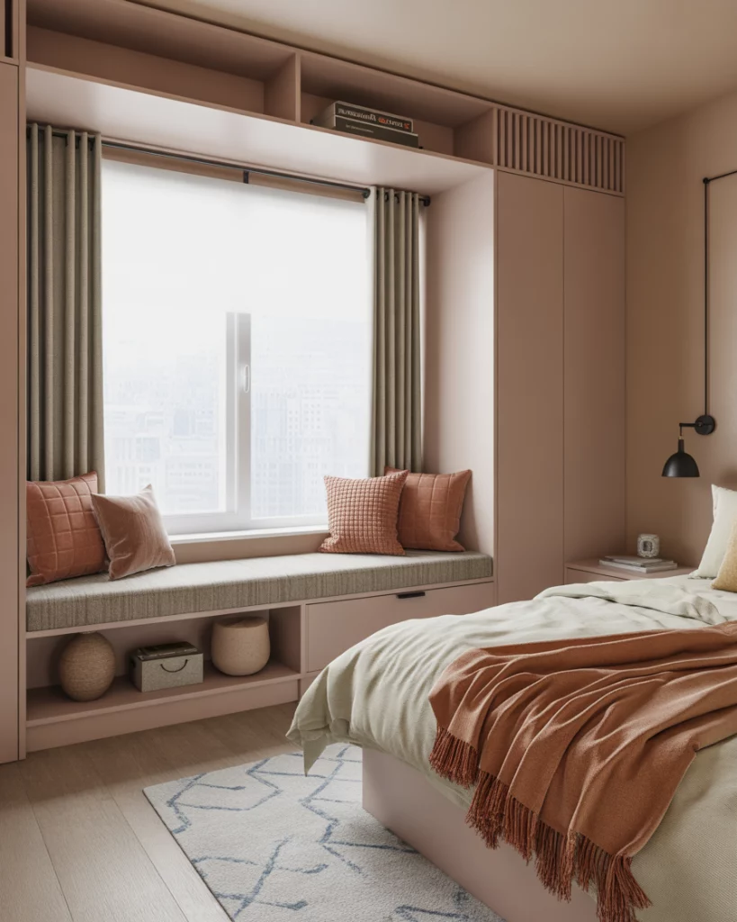 If you have a window nook, transform it into a built-in bench with storage drawers underneath. It’s an extra cozy feature that creates a reading spot and adds hidden space for linens or shoes. Ideal for couples or teens, this trick optimizes every inch of your apartment. Add plush cushions and throw pillows for a cozy aesthetic.