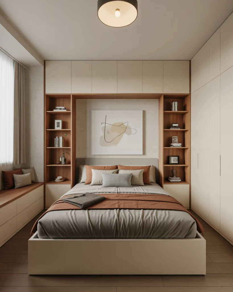 For a small bedroom, especially for couples or roommates, an elevated platform bed with built-in drawers or shelving underneath becomes extremely efficient. Instead of a bulky chest of drawers across the room, the bed itself stores extra clothing, linens or shoes—freeing floor space and giving the room a very cozy feel. The layout typically places the bed along the longest wall, leaving open pathways to the closet or door. If you’re using a king size bed, be mindful of scale, but even there built-in under-bed storage makes a huge difference. As designers at IKEA suggest for small spaces: multifunctional furniture is key.