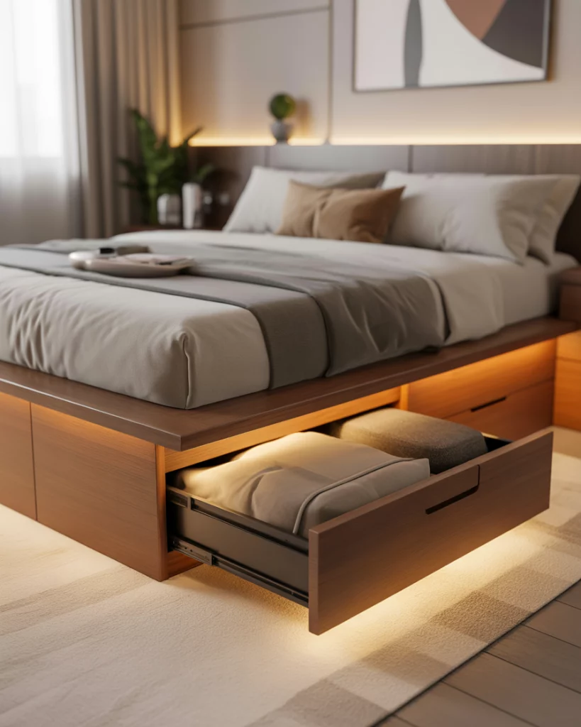 1. Elevated Platform Bed with Built-In Storage