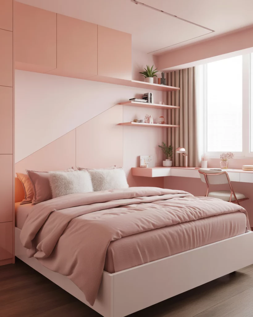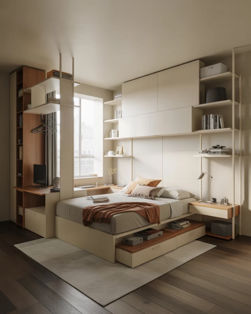 In a small apartment or compact room, combining functions helps keep the space open. A wall-mounted fold-down desk or vanity that tucks away when not in use lets you create a workspace or dressing area without sacrificing the cozy relaxing sleeping zone. This setup works especially well for teens or adults who work from home, and you can pair it with a slim closet or wardrobe along an adjacent wall. Designers emphasise that in small bedrooms “furniture floats” unless it’s well anchored or built in.