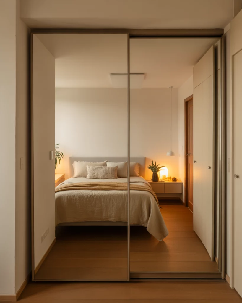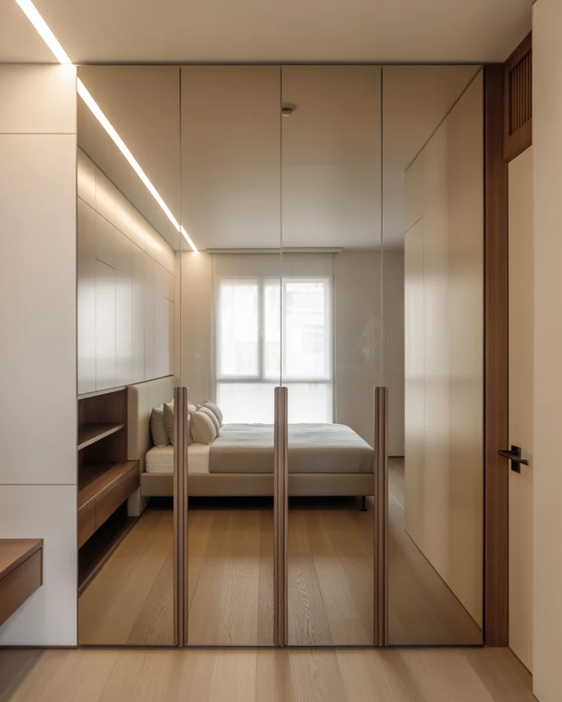 In smaller rooms, TV walls, wardrobes and mirrors can be more than functional—they can visually expand the space. A large mirror opposite a window or integrated mirrored wardrobe doors bounce light and depth, making the room appear very open yet still cozy. The key is not over-doing reflective surfaces, but strategically placing one or two to amplify natural light. As highlighted: mirrors are “the ultimate trick for making a room feel more spacious.”