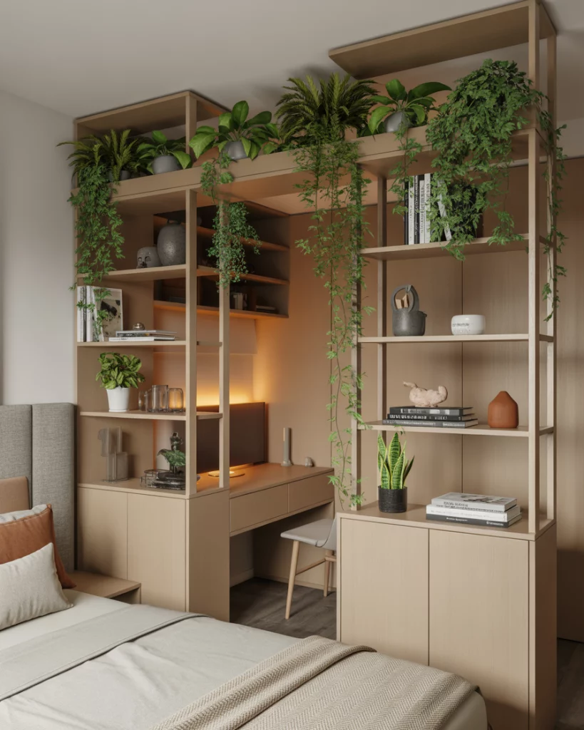 When your bedroom doubles as a layout for work or relaxation, a soft divider—like a fabric screen, shelving unit, or half-height wall—helps define spaces without making them feel closed off. This technique is super effective in studio apartments or shared rooms. Choose a divider with built-in storage or plants for extra texture and warmth.