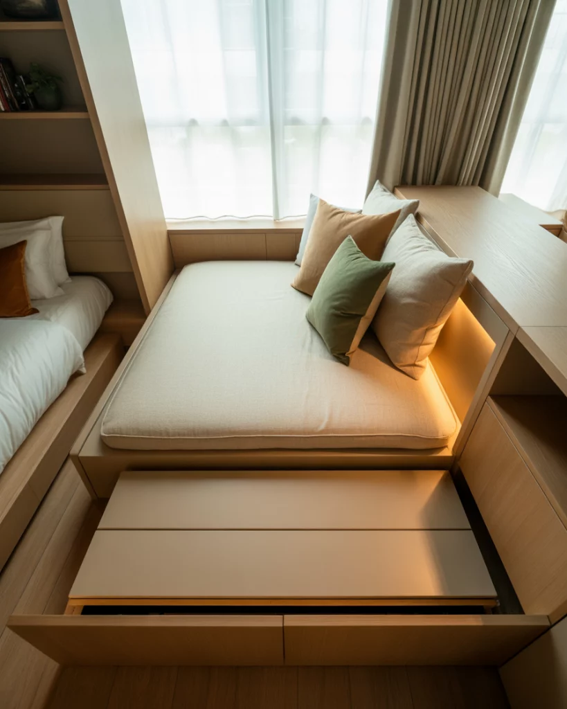 Especially in shared bedrooms (for siblings or teens) or micro-apartments, a loft bed or high bed structure lifts the sleeping space off the floor. Beneath you can create a study nook, a seating zone, or storage drawers. Even for a single bed, this makes a huge difference in usable area. It delivers a super flexible small-space solution with a cozy vibe.