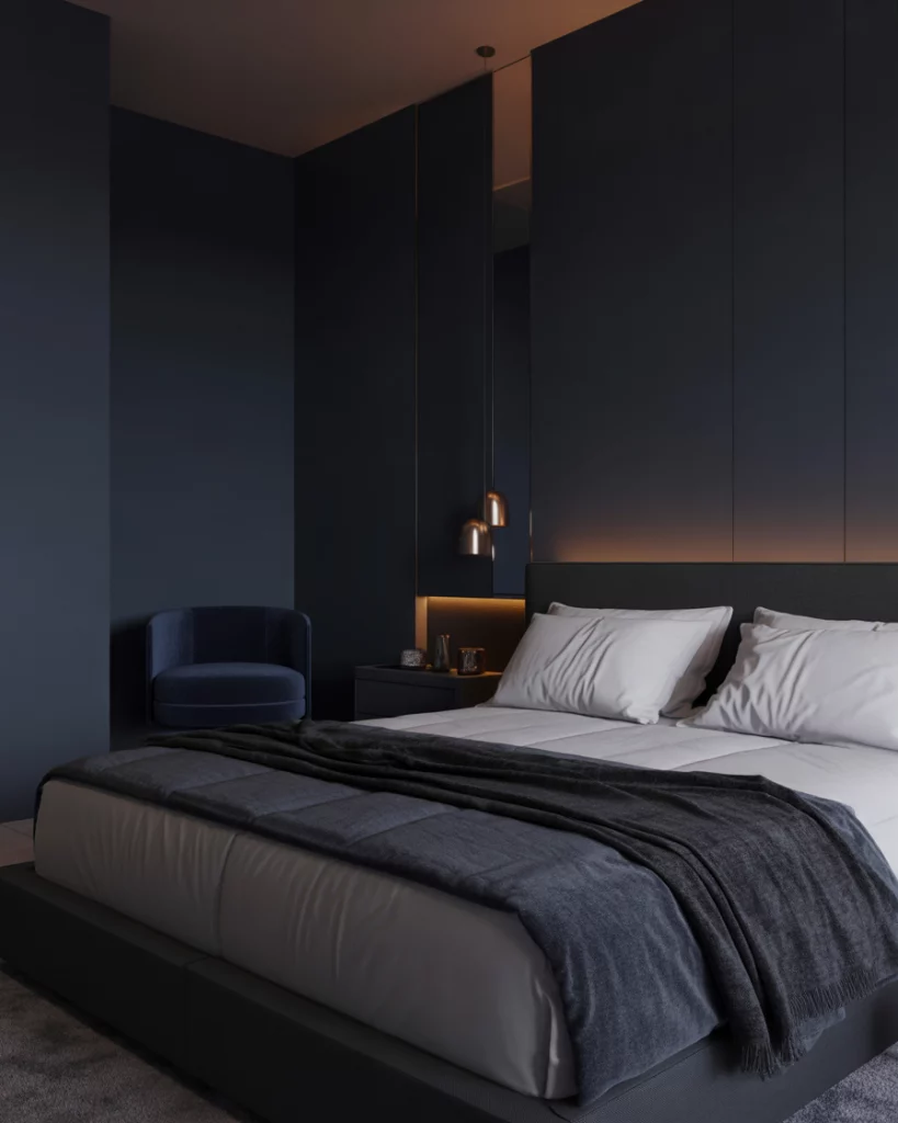 While light colours enlarge a space, deep tones—charcoal, navy, or forest green—create a sense of very cozy intimacy, especially appealing for couples. Use matte textures and layered lighting to prevent the room from feeling heavy. This aesthetic feels sophisticated, for men and women alike, and works beautifully with gold or brass accents.