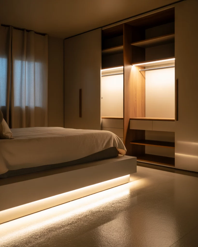 The lighting system with motion sensors located below the bed or inside the closet will provide discreet lighting in the dark room, making the room even more enjoyable for relaxation.