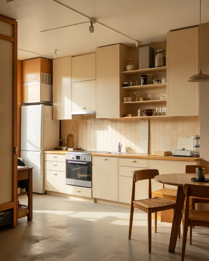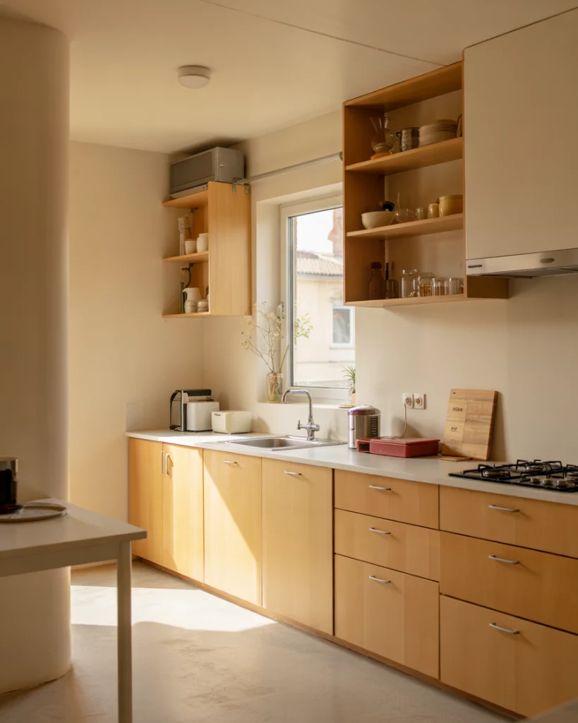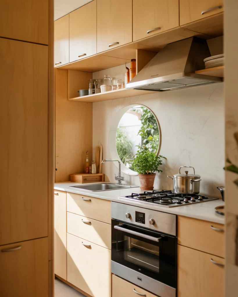 This layout, in a compact apartment, remains a favorite for single-wall kitchens, influencing small kitchen ideas for 2026. Everything lines up efficiently. It lets the entire room breathe. This layout and design can feel streamlined, intentional, and architectural rather than a design compromise. Vertical storage, from a pragmatic point of view, is what makes this work. Streamlined, consistent materials tie the run together, while tall cabinets maintain tidy clutter control. It remains ideal for open-plan spaces where circulation is key.