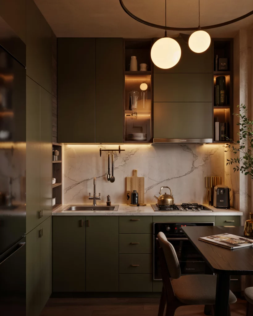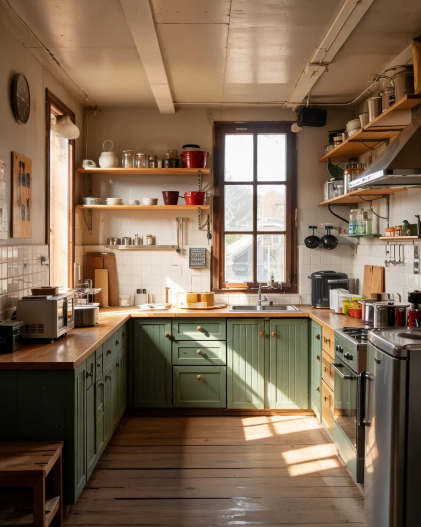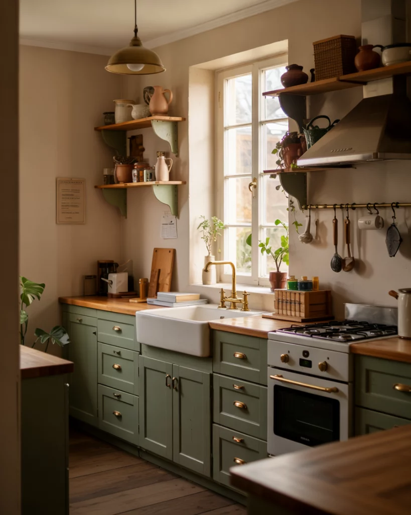 A cozy kitchen layered in green tones feels fresh for 2026, even in small footprints. Soft paint colors, warm wood, and thoughtful decor choices turn a compact layout into something inviting rather than utilitarian. This idea leans into color as a mood-setter, making the kitchen feel like a lived-in room instead of a pass-through. A common mistake is going too dark or using green on every surface. Balance is key: pair color with light counters and reflective finishes. Keeping upper cabinets lighter prevents the space from feeling boxed in.