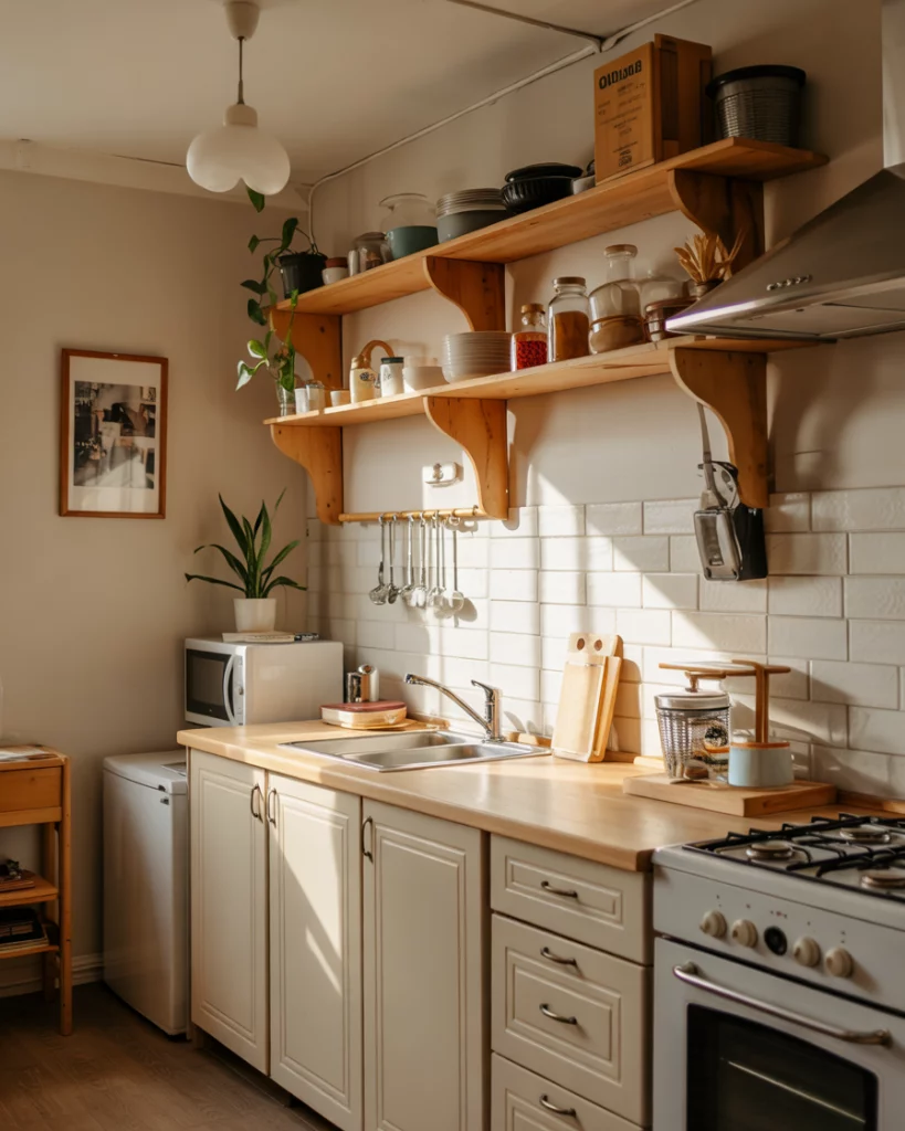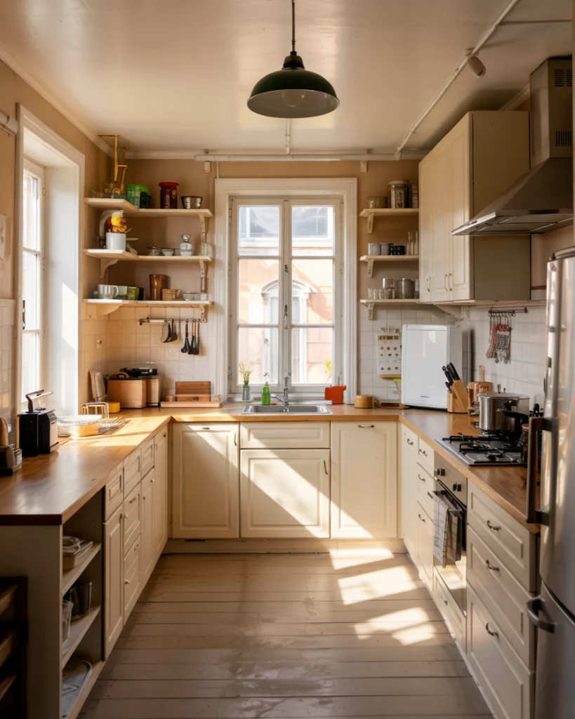 The 2mx2m kitchen proves that smart layout beats square footage. Popular in compact apartment living, this idea focuses on precision storage, integrated appliances, and visual clarity. It’s one of the most searched small kitchen ideas of 2026 for city dwellers. A practical insight here is that every inch must earn its place. Pull-out storage and multi-use surfaces matter more than decorative extras.