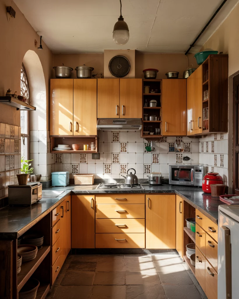 An Indian-inspired modern kitchen blends bold finishes with efficient storage, perfect for compact spaces. Rich textures, durable surfaces, and thoughtful ventilation shape this take on small kitchen ideas for 2026, especially for households that cook daily. Prioritizing easy-clean materials is essential when cooking frequently in a tight space.