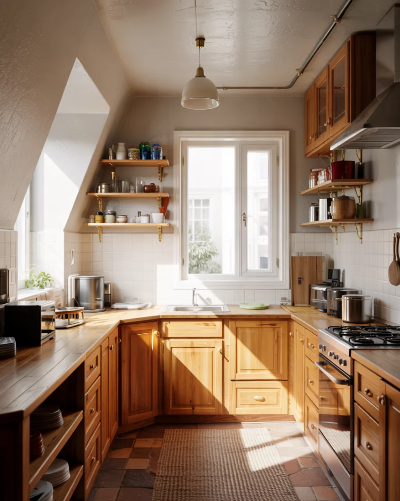 A rustic approach brings texture and comfort to small kitchen ideas in 2026. Natural wood, handmade finishes, and layered decorating details soften compact design layouts. The result feels collected over time rather than overly styled. A micro anecdote often shared by homeowners is how these kitchens become gathering spots despite their size. The warmth encourages lingering, coffee refills, and conversation.