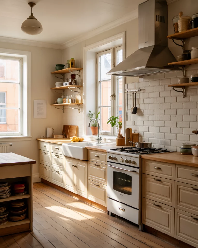 An Ikea-inspired, simple budget kitchen is central to many small kitchen ideas for 2026. Flat-pack systems, modular storage, and neutral finishes make it easier to remodel without overcommitting. The look is clean, flexible, and especially appealing to first-time homeowners and renters alike. From a budget angle, the real savings come from keeping the layout intact and upgrading fronts, hardware, or lighting instead. This approach delivers visual impact without the cost of major construction.
