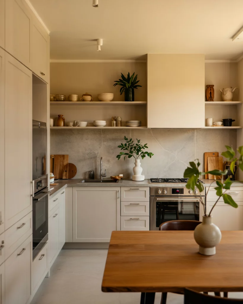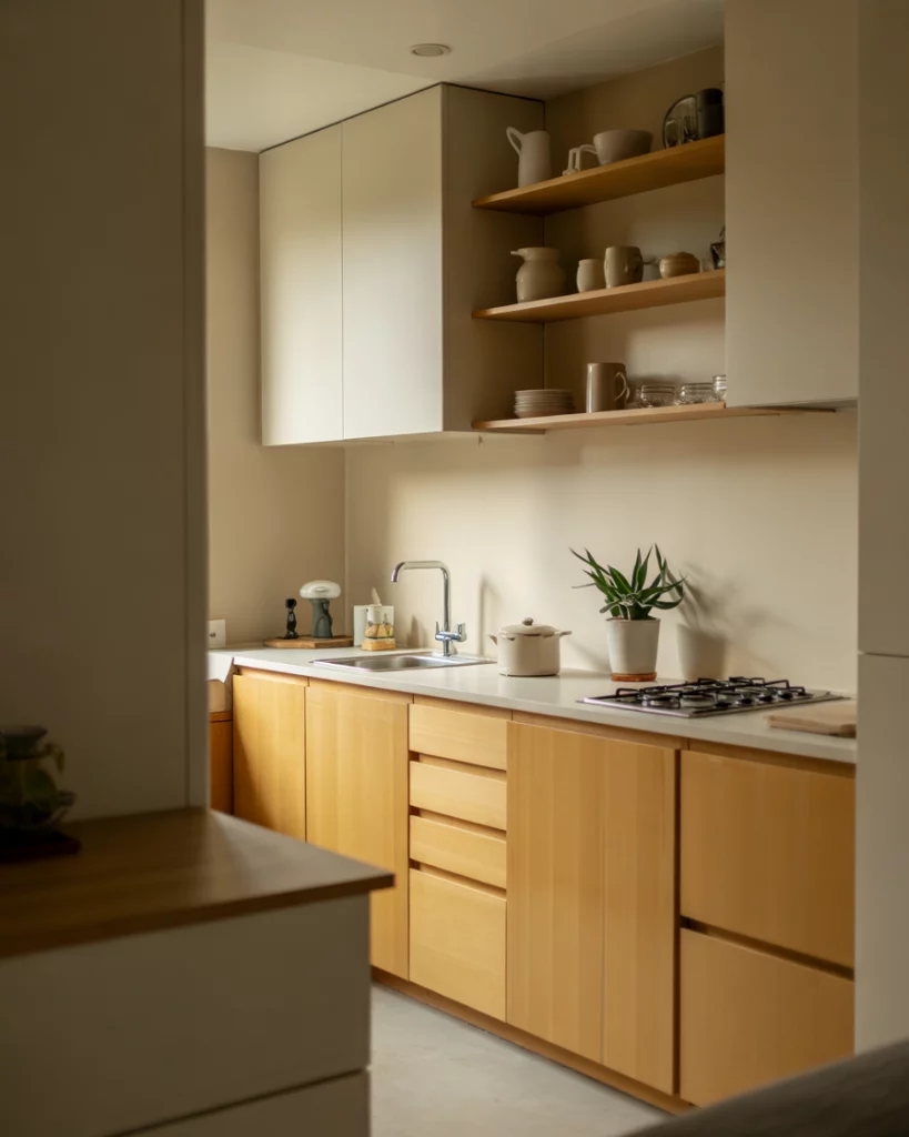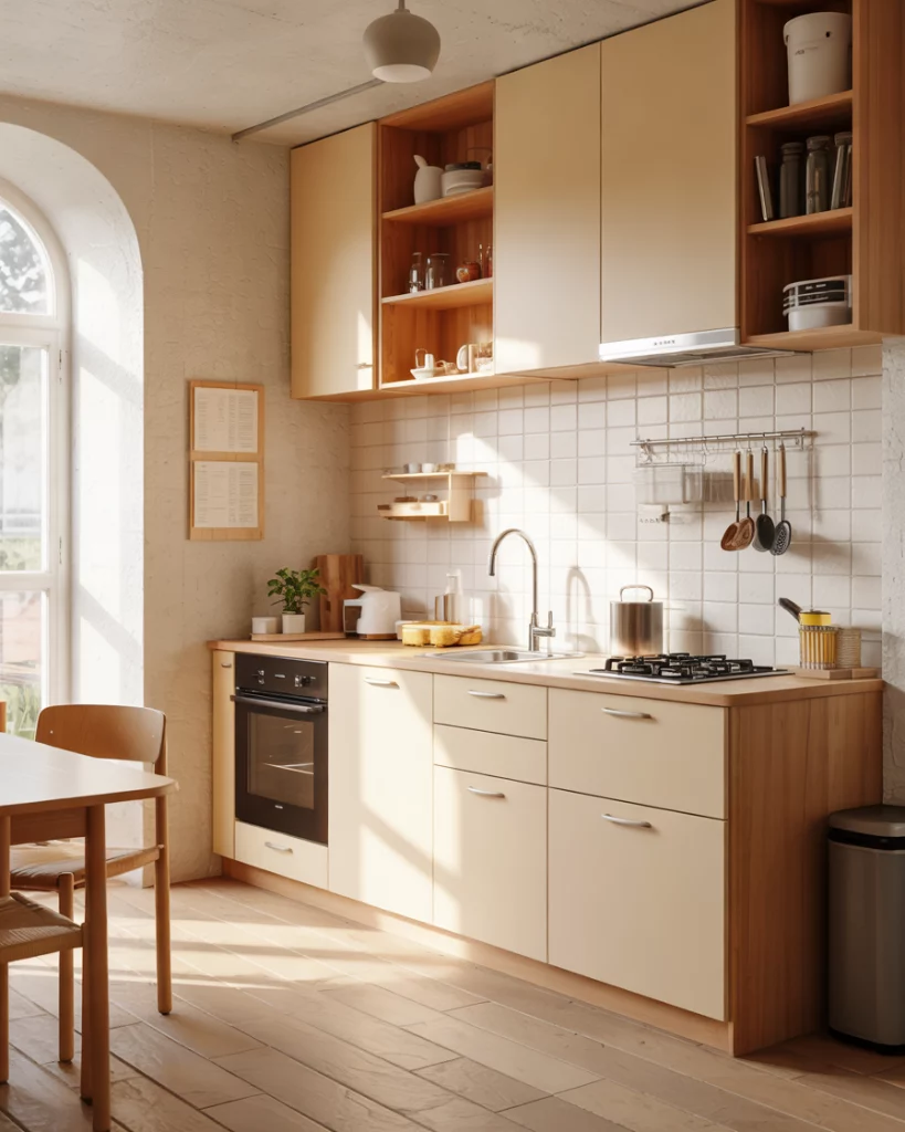 This layout, in a compact apartment, remains a favorite for single-wall kitchens, influencing small kitchen ideas for 2026. Everything lines up efficiently. It lets the entire room breathe. This layout and design can feel streamlined, intentional, and architectural rather than a design compromise. Vertical storage, from a pragmatic point of view, is what makes this work. Streamlined, consistent materials tie the run together, while tall cabinets maintain tidy clutter control. It remains ideal for open-plan spaces where circulation is key.