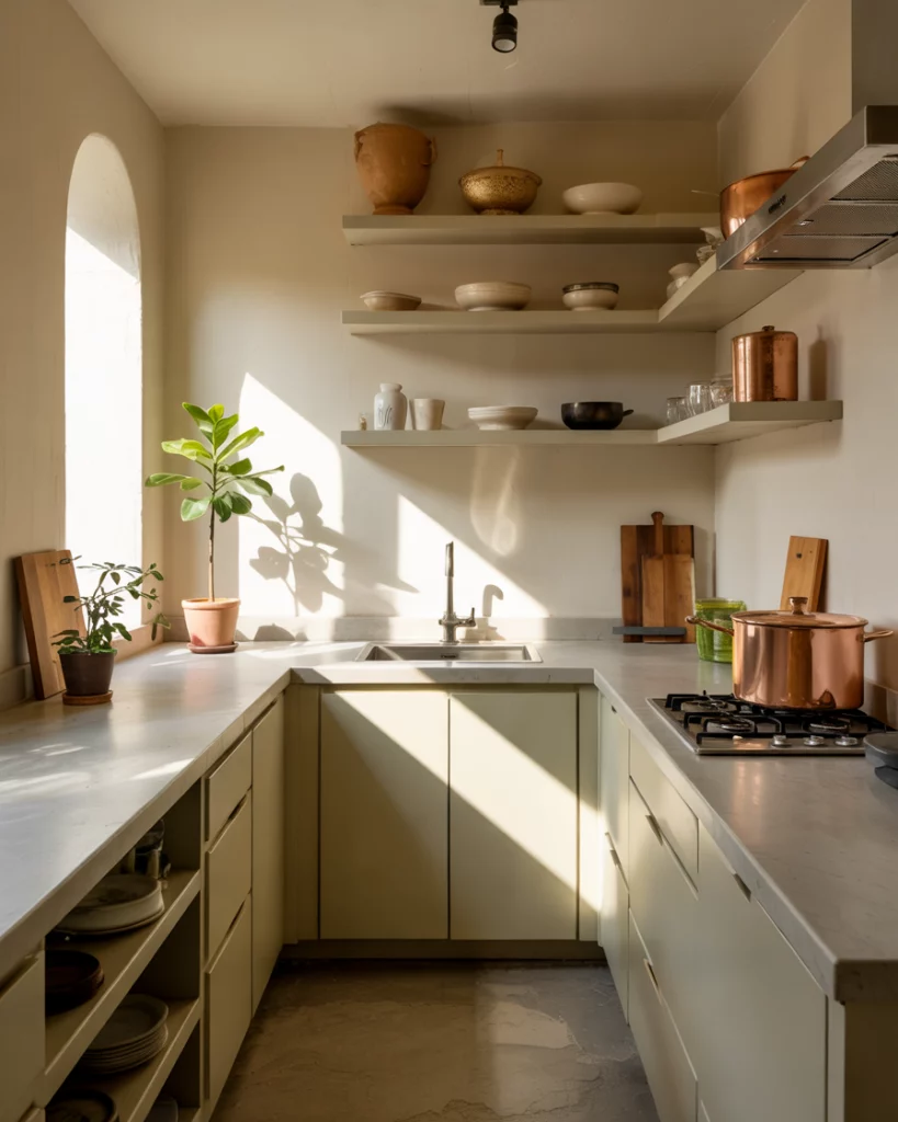 The 2mx2m kitchen proves that smart layout beats square footage. Popular in compact apartment living, this idea focuses on precision storage, integrated appliances, and visual clarity. It’s one of the most searched small kitchen ideas of 2026 for city dwellers. A practical insight here is that every inch must earn its place. Pull-out storage and multi-use surfaces matter more than decorative extras.