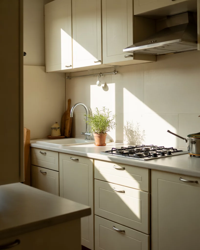 A very compact kitchen depends almost entirely on a smart layout. In many American apartments, shrinking footprints mean every cabinet and appliance must earn its place. This idea focuses on symmetry, streamlined surfaces, and visually quiet materials to make even the smallest kitchens feel intentional rather than temporary. Where it works best is in older city buildings where kitchens were never meant to be social spaces. When the layout is optimized, daily cooking feels smoother despite limited room.