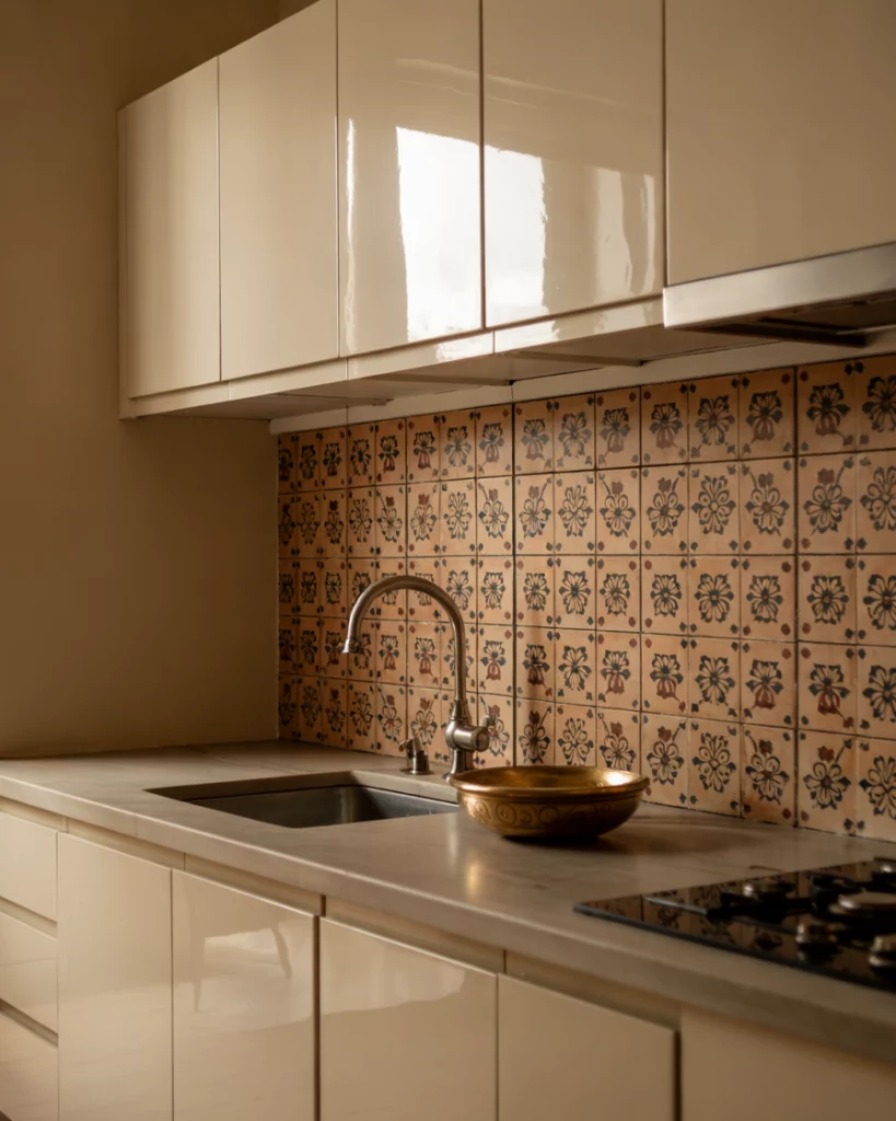 An Indian-inspired modern kitchen blends bold finishes with efficient storage, perfect for compact spaces. Rich textures, durable surfaces, and thoughtful ventilation shape this take on small kitchen ideas for 2026, especially for households that cook daily. Prioritizing easy-clean materials is essential when cooking frequently in a tight space.