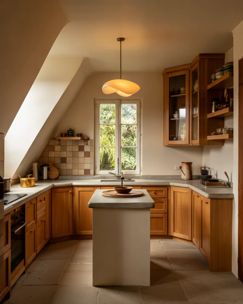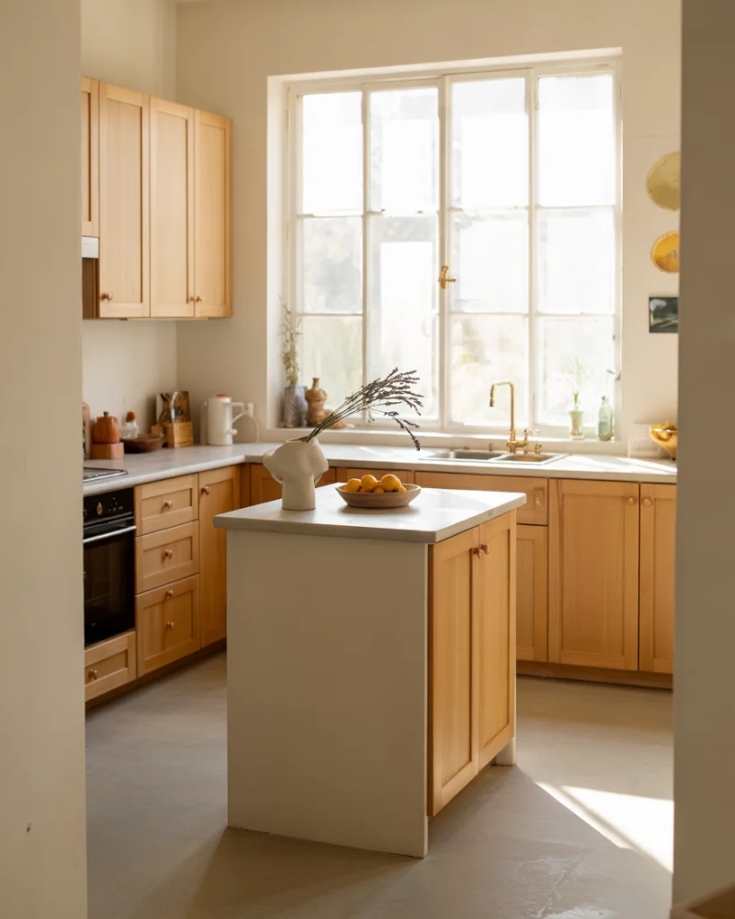 An aesthetic approach defines this fresh take on small kitchen ideas for 2026, pairing a super slim island with a smart layout on a budget. Soft colors, gentle textures, and visually light materials help the kitchen feel curated without being precious. The island stays narrow and intentional, offering just enough surface for prep or casual meals while preserving flow in a compact footprint.