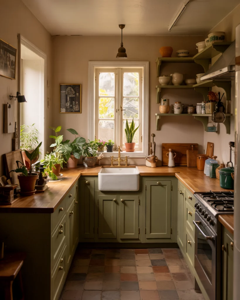 A cozy kitchen layered in green tones feels fresh for 2026, even in small footprints. Soft paint colors, warm wood, and thoughtful decor choices turn a compact layout into something inviting rather than utilitarian. This idea leans into color as a mood-setter, making the kitchen feel like a lived-in room instead of a pass-through. A common mistake is going too dark or using green on every surface. Balance is key: pair color with light counters and reflective finishes. Keeping upper cabinets lighter prevents the space from feeling boxed in.