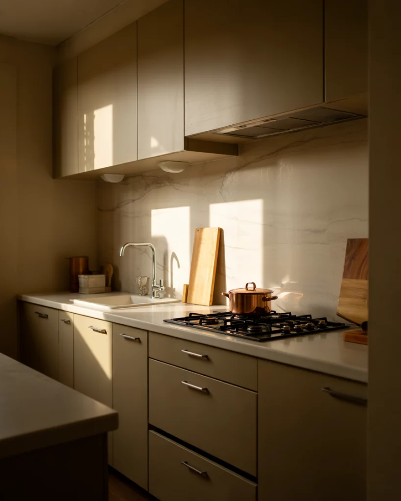 A modern, simple approach is shaping many small kitchen ideas for 2026, especially in the American apartment market. Clean lines, handle-less cabinets, and pared-down finishes help compact kitchens feel calm rather than crowded. This idea works by stripping the space to its essentials while letting texture, light, and proportion do the heavy lifting instead of decoration. Where it works best is in urban rentals or condos where square footage is tight and visual noise quickly overwhelms the room. This style thrives when storage is planned wall to wall and finishes stay consistent. It’s especially effective in studios, where the kitchen is always on display.