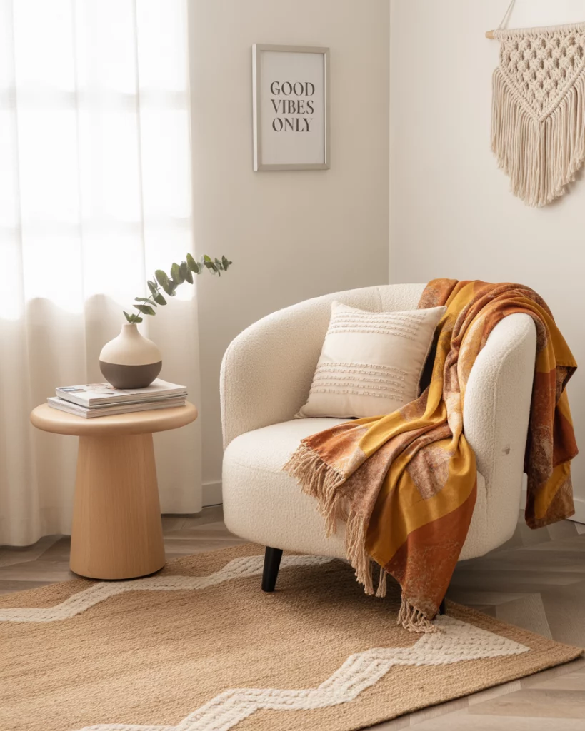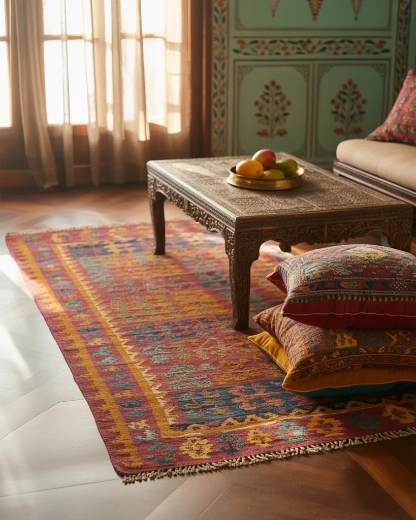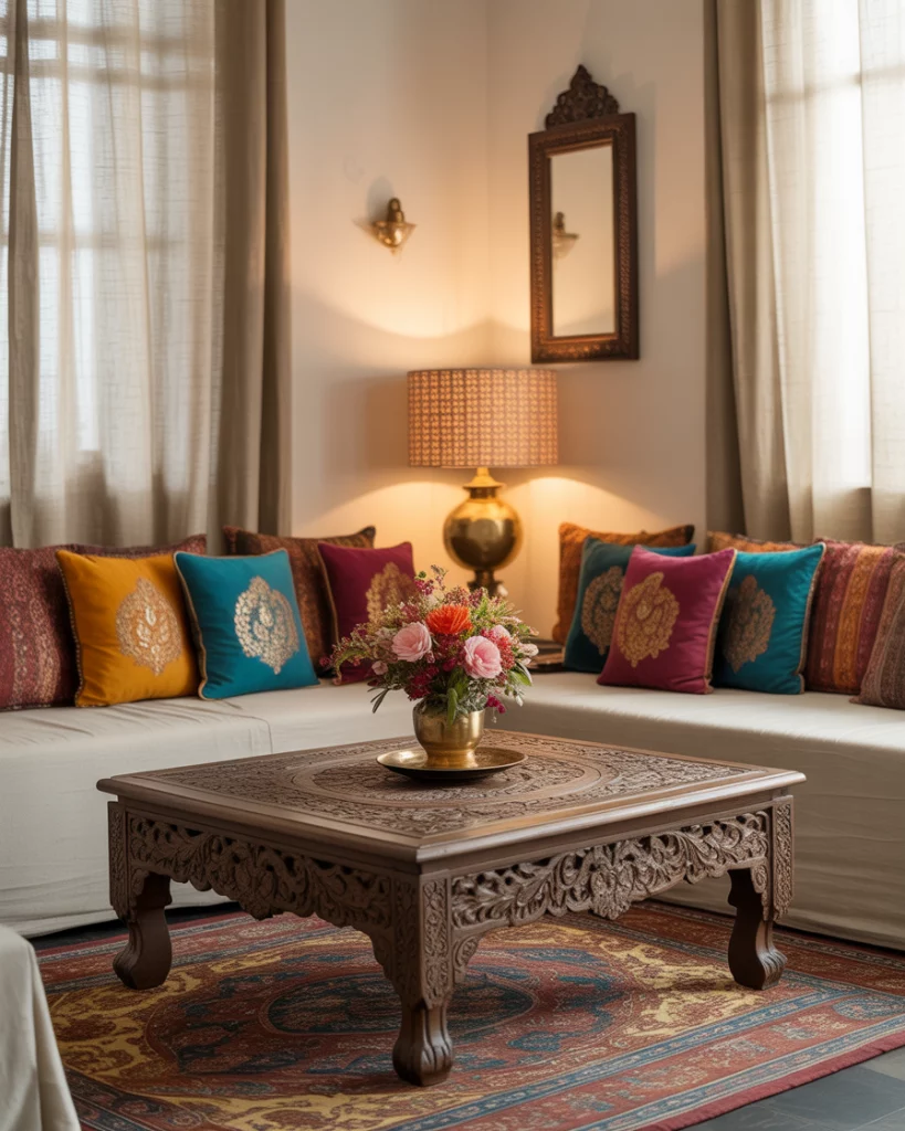 The Indian touch—kantha quilts, embroidered cushions, block-printed curtains—adds soul to a neutral layout. When I draped a handwoven throw over my beige couch, it instantly turned plain minimalism into something very colorful and meaningful. This blend feels both bohemian and timeless, bringing story and craftsmanship into your space.